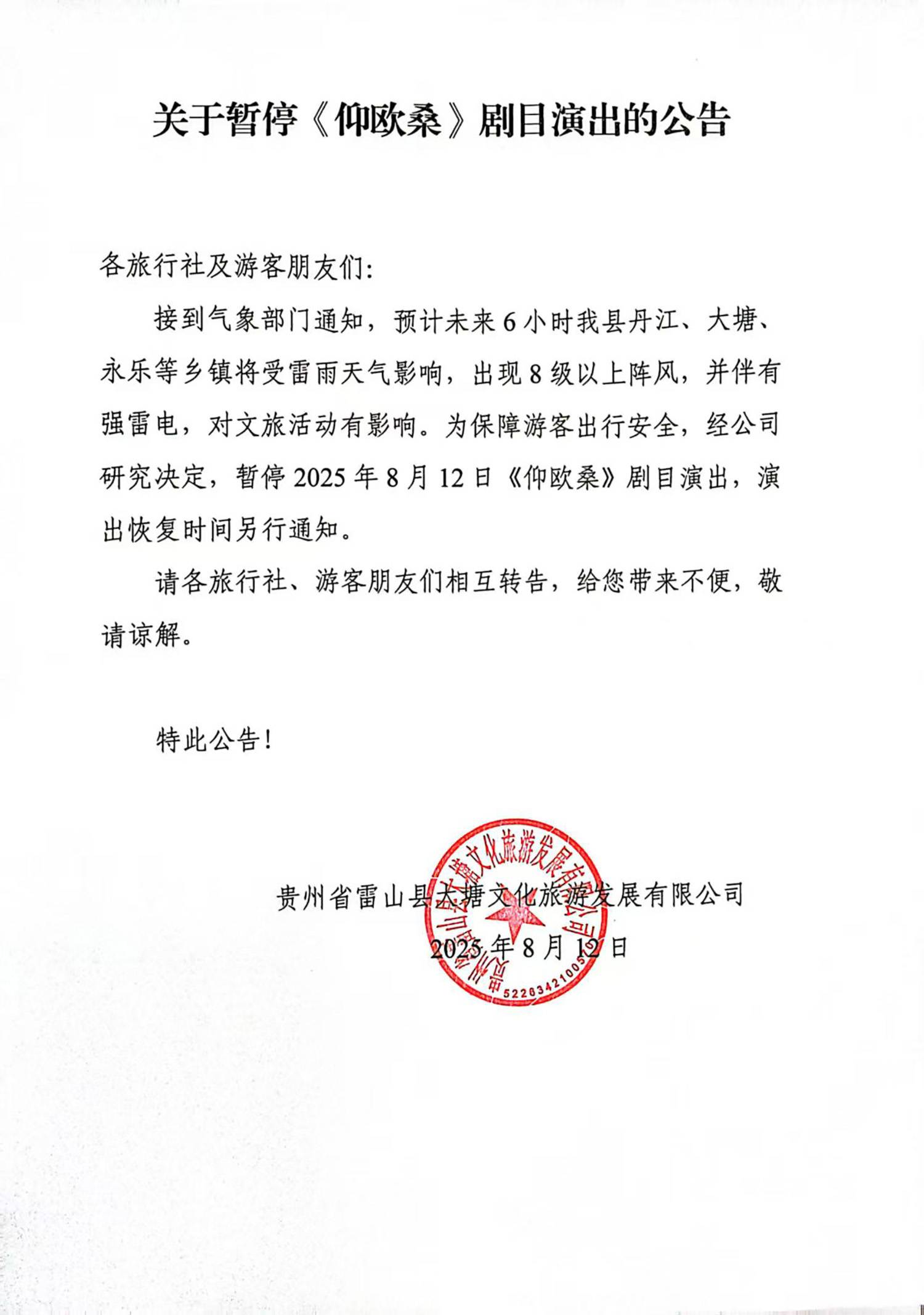 关于8月12日大型实景苗族歌舞诗剧《仰欧桑》剧目演出暂停的公告