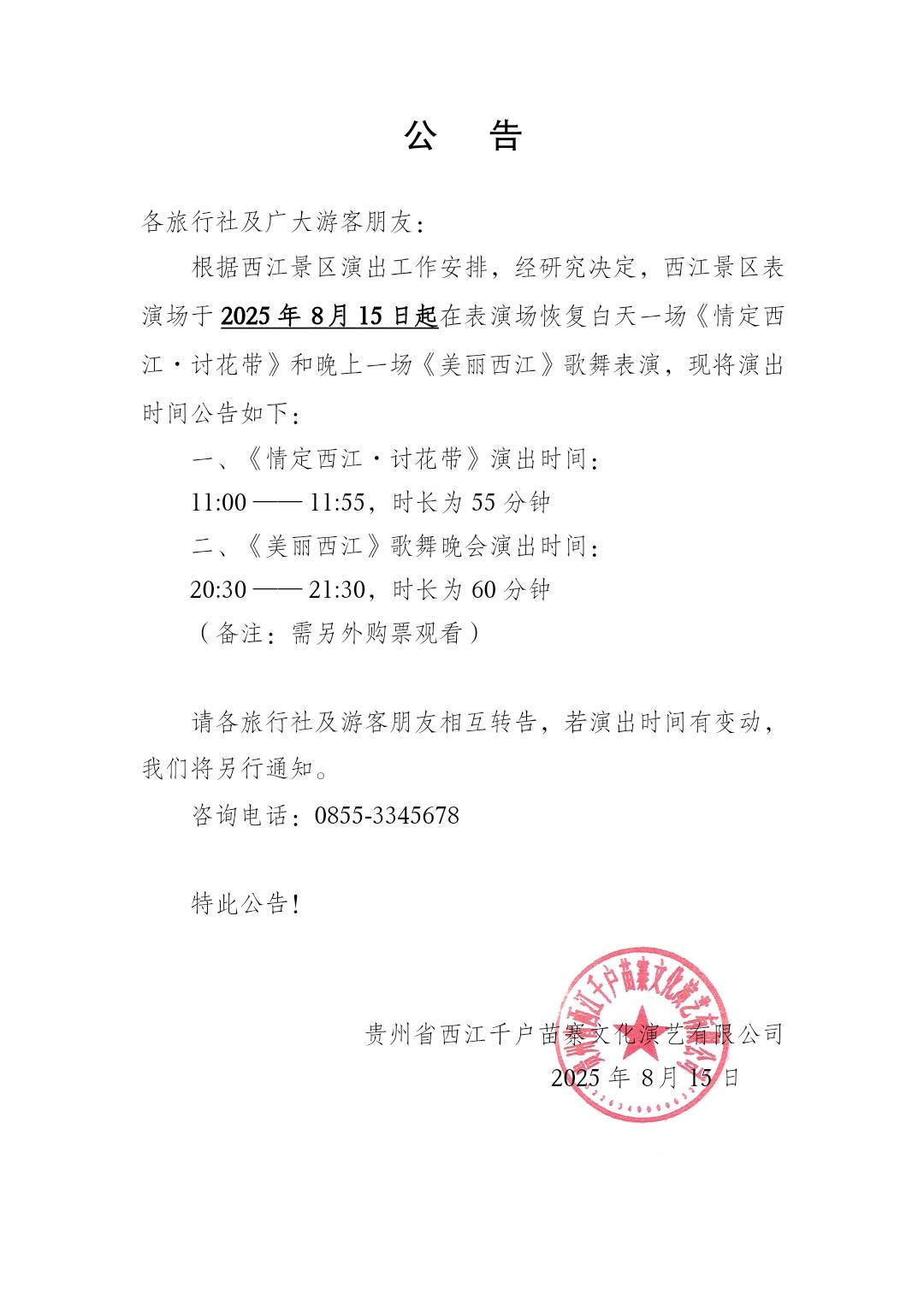 《情定西江·讨花带》和《美丽西江》演出时间变动