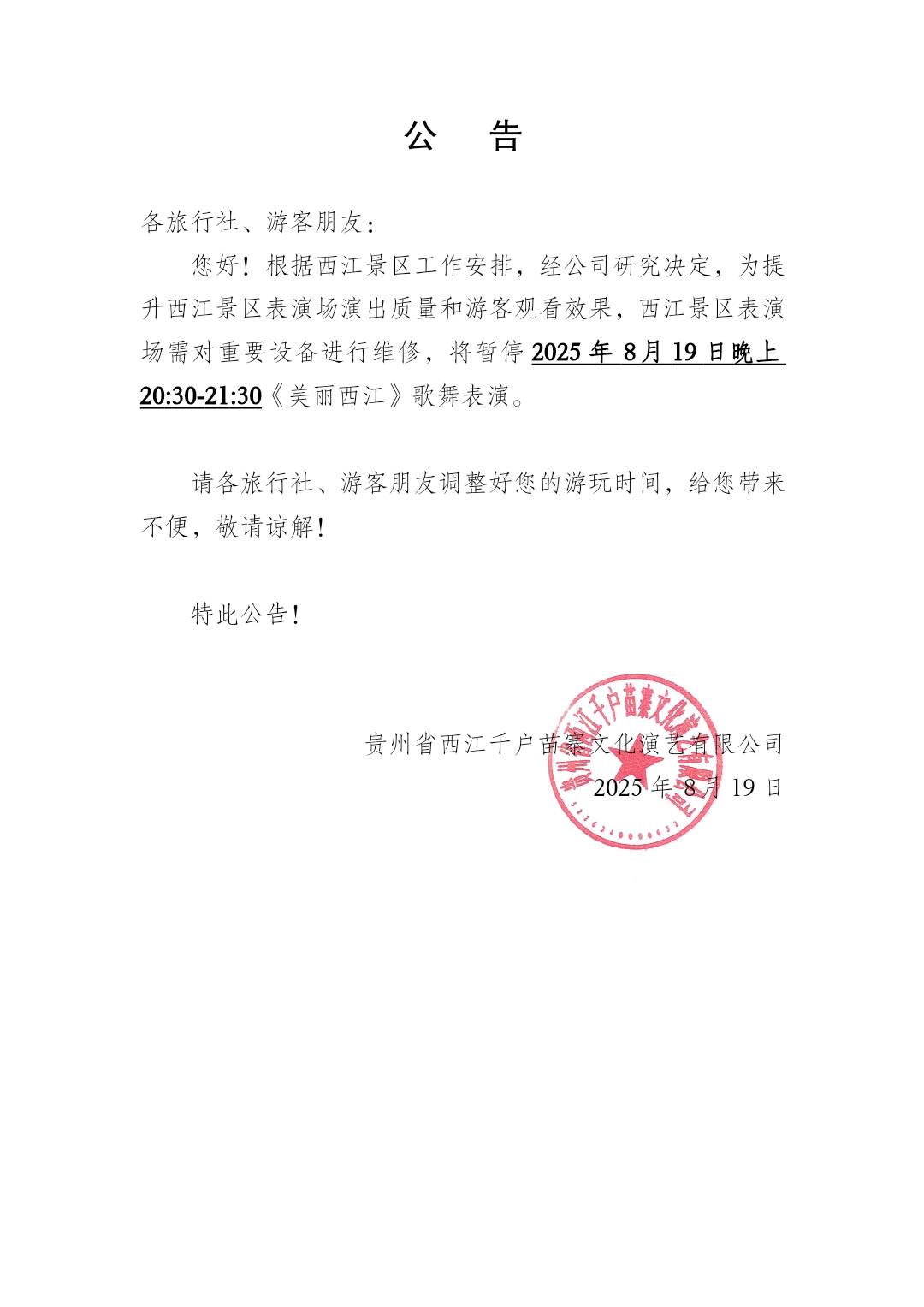 《美丽西江》歌舞表演暂停表演公告