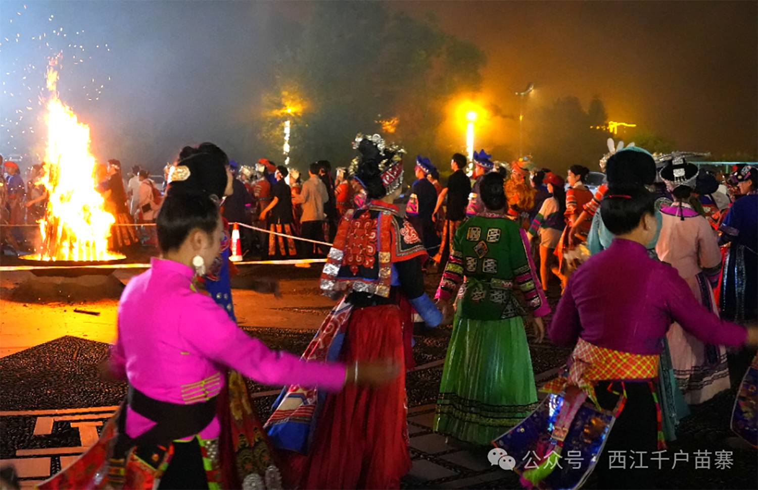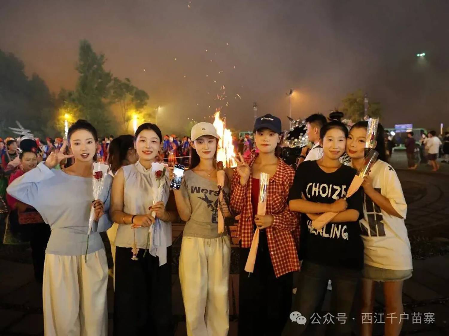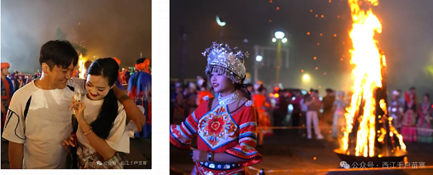看完《仰欧桑》,剧场的浪漫氛围延续,回到西江苗寨,篝火升起,整个寨子都热闹起来。熊熊火焰照亮一张张笑脸,情侣们围着篝火跳着苗家舞蹈,脚步时而轻快时而默契。旁边的情侣派对上,大家分享着白天的趣事……