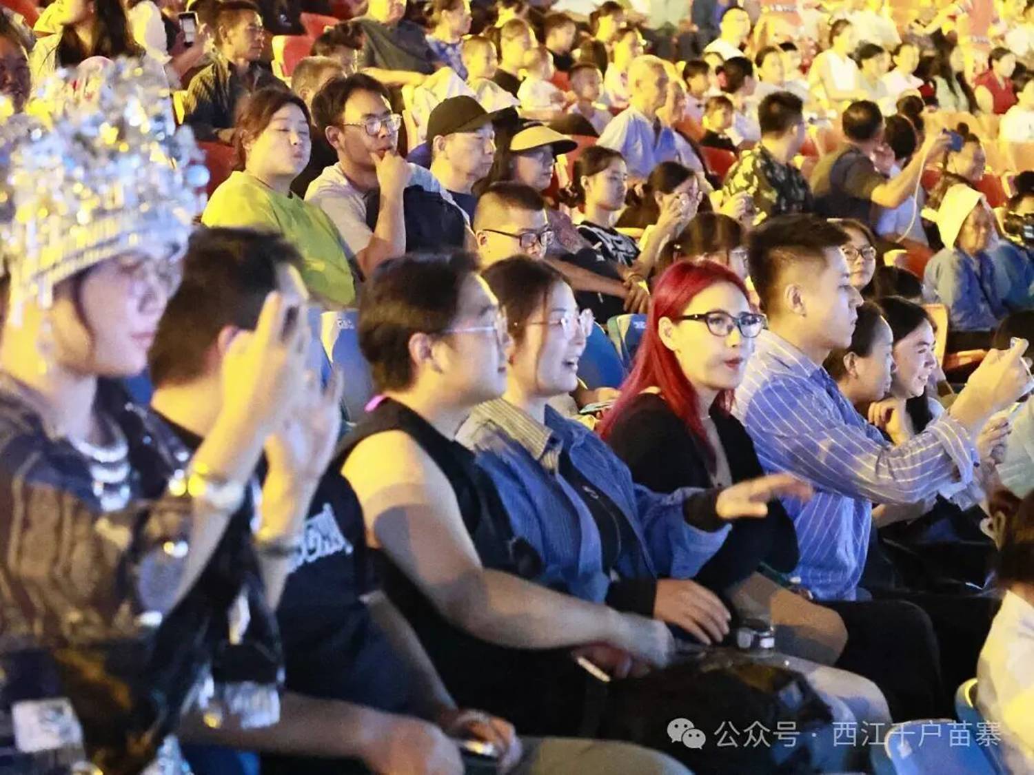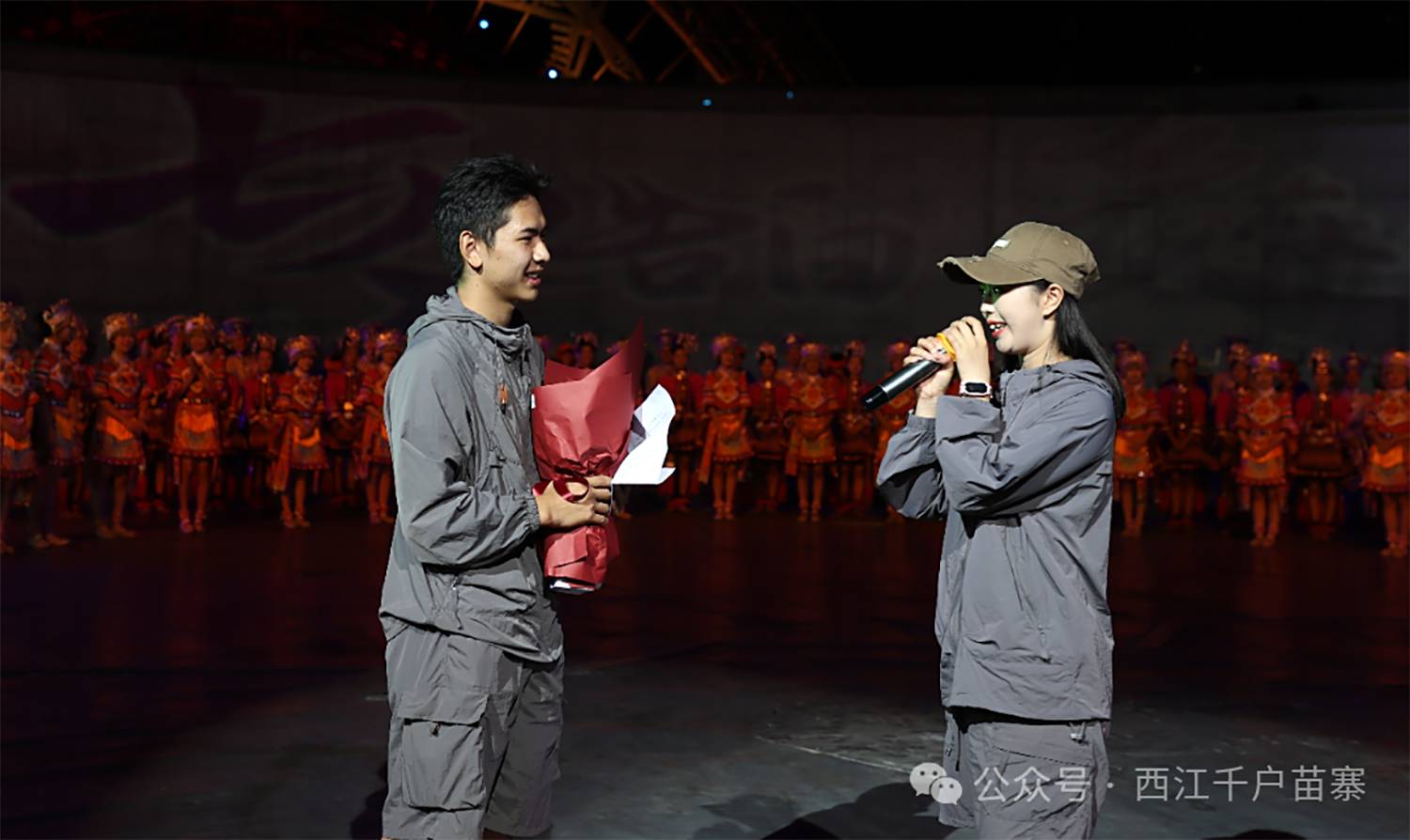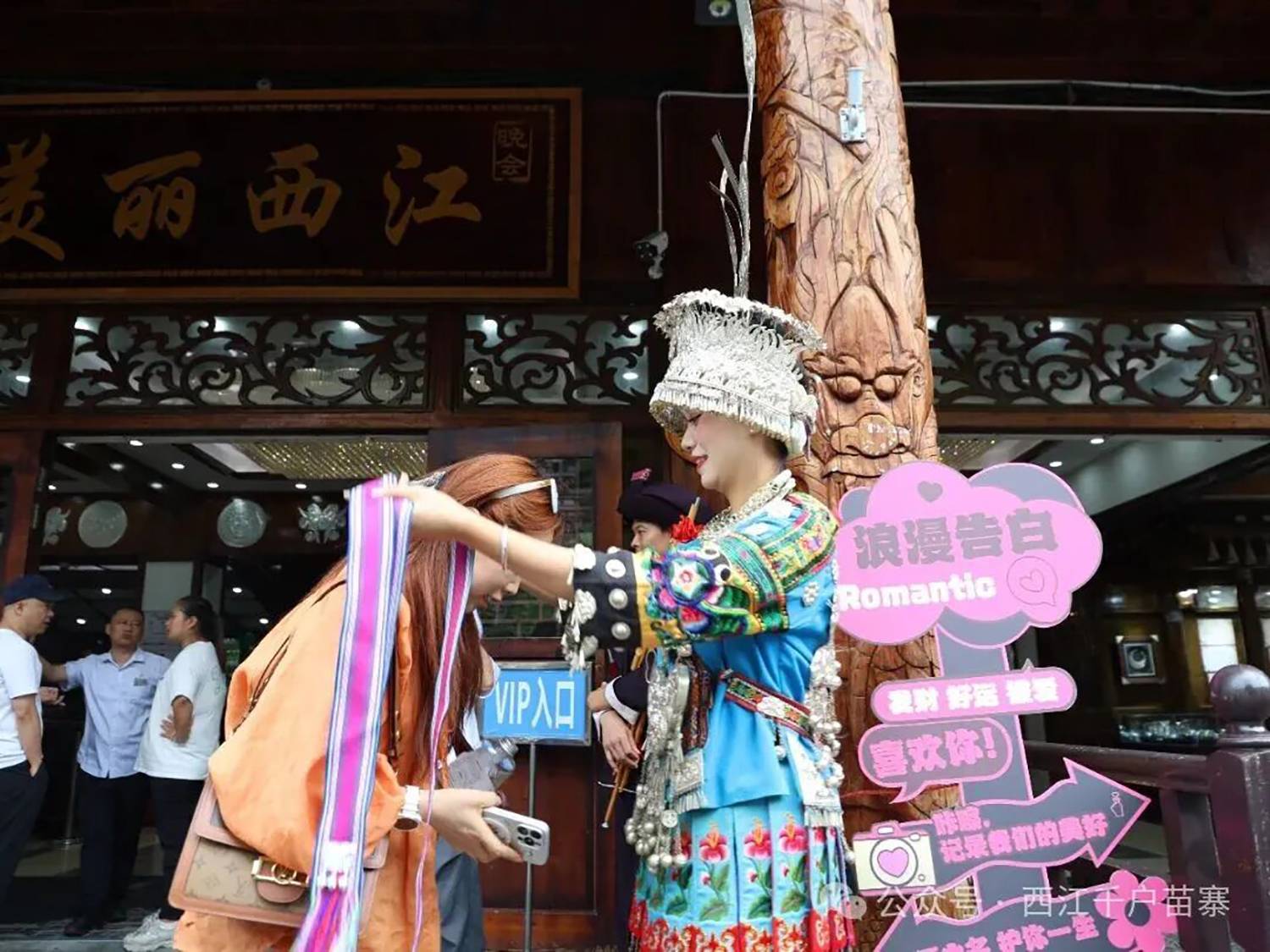 美丽西江表演场,游客们积极参与其中,在工作人员的指导下,学着苗族青年的样子,向自己的伴侣送上花带,传递着苗家浪漫。