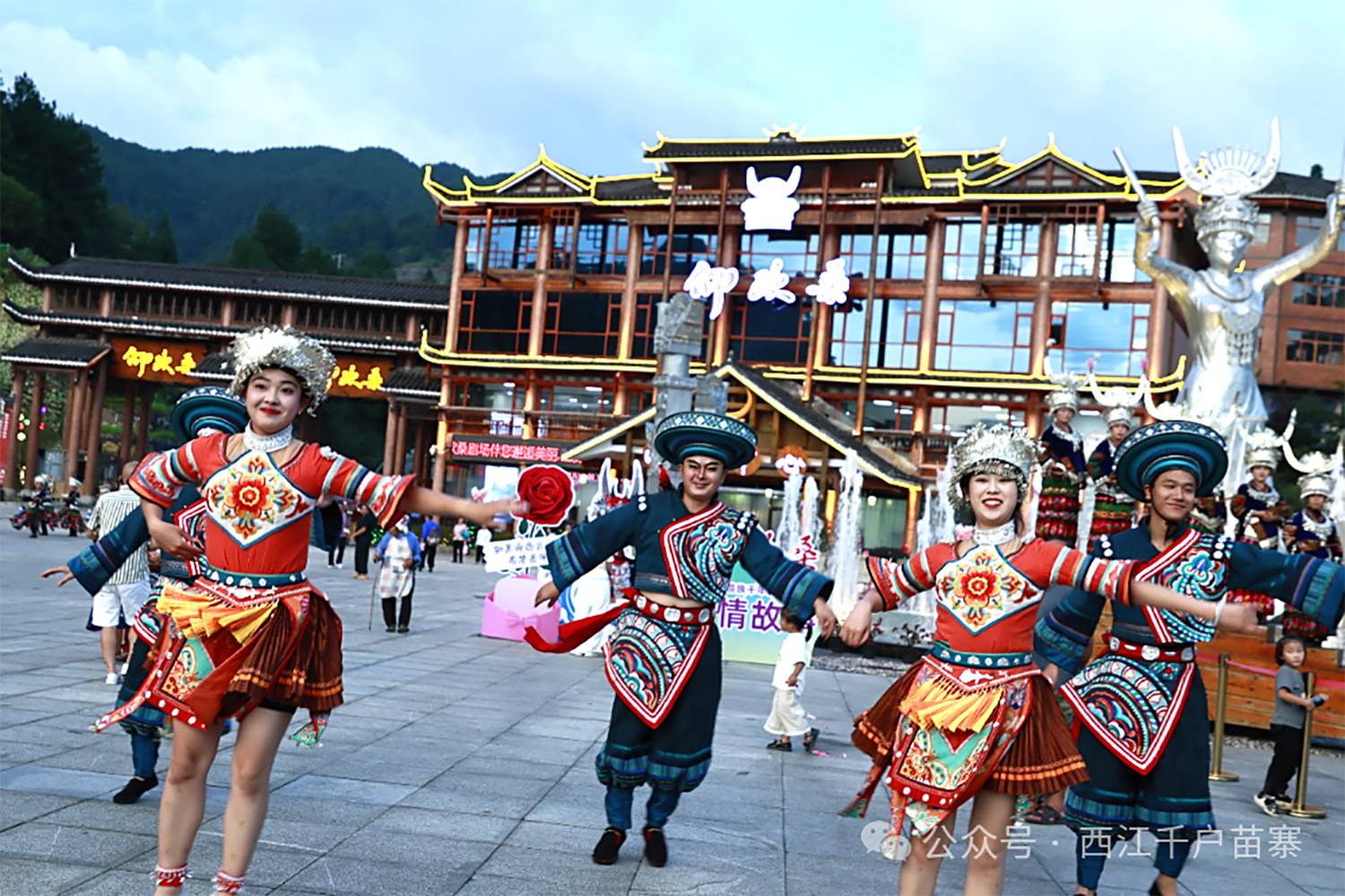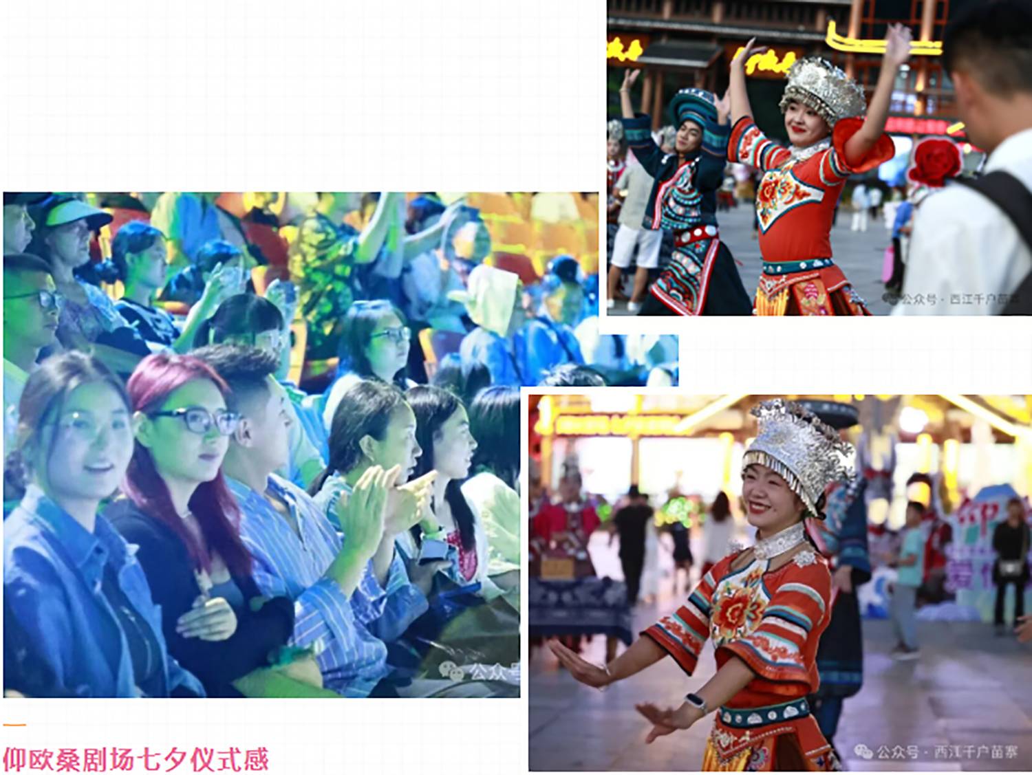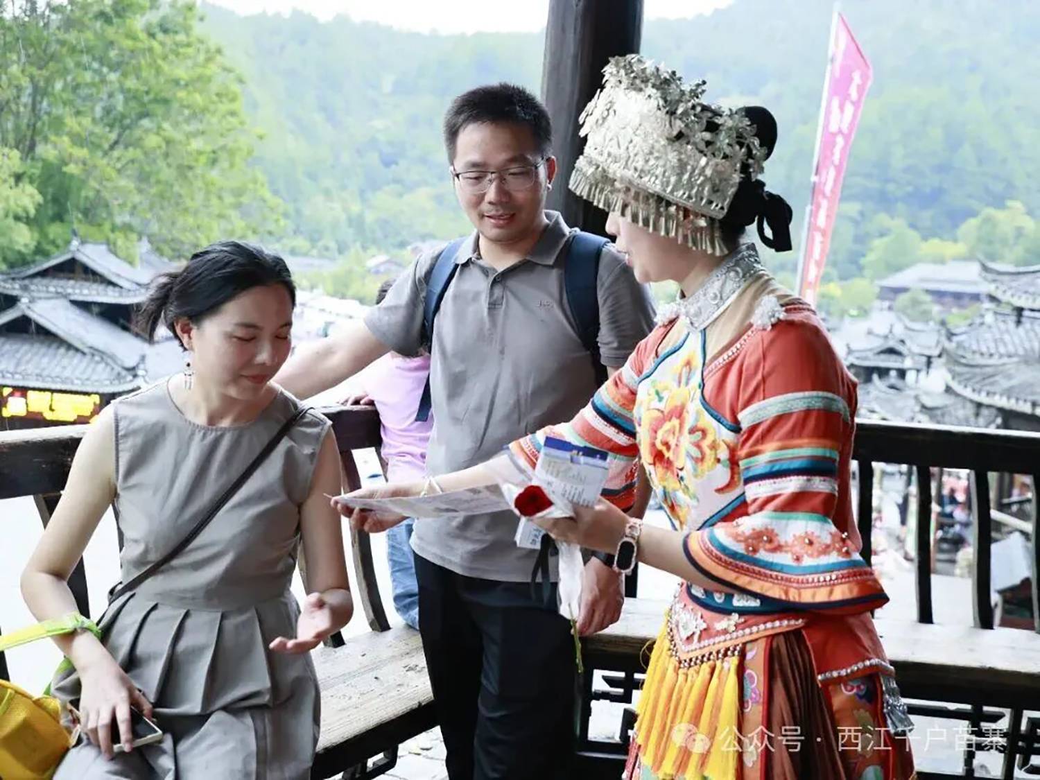 美丽西江表演场,游客们积极参与其中,在工作人员的指导下,学着苗族青年的样子,向自己的伴侣送上花带,传递着苗家浪漫。