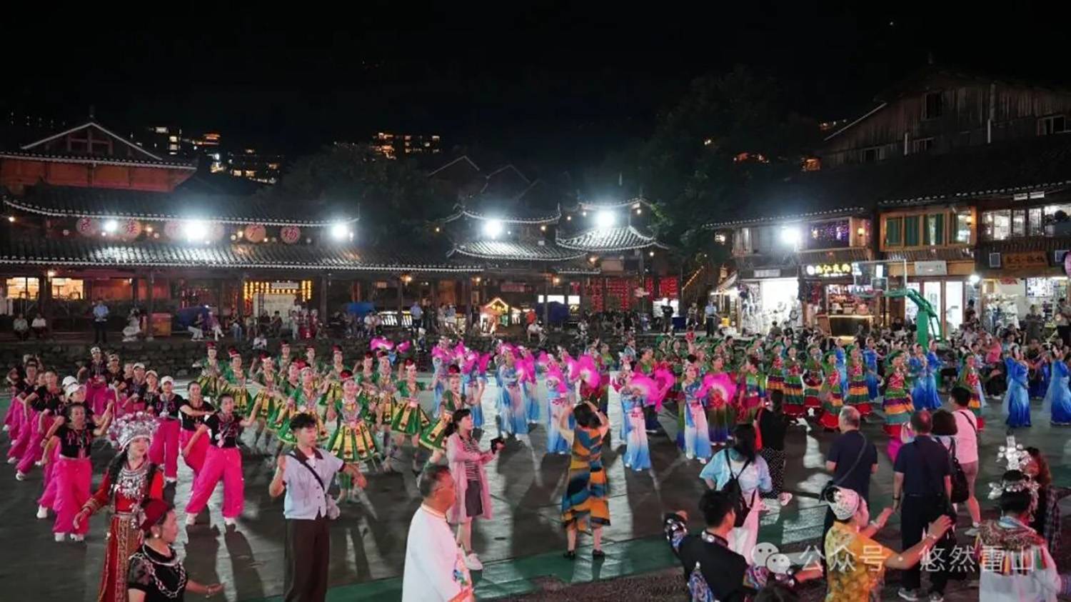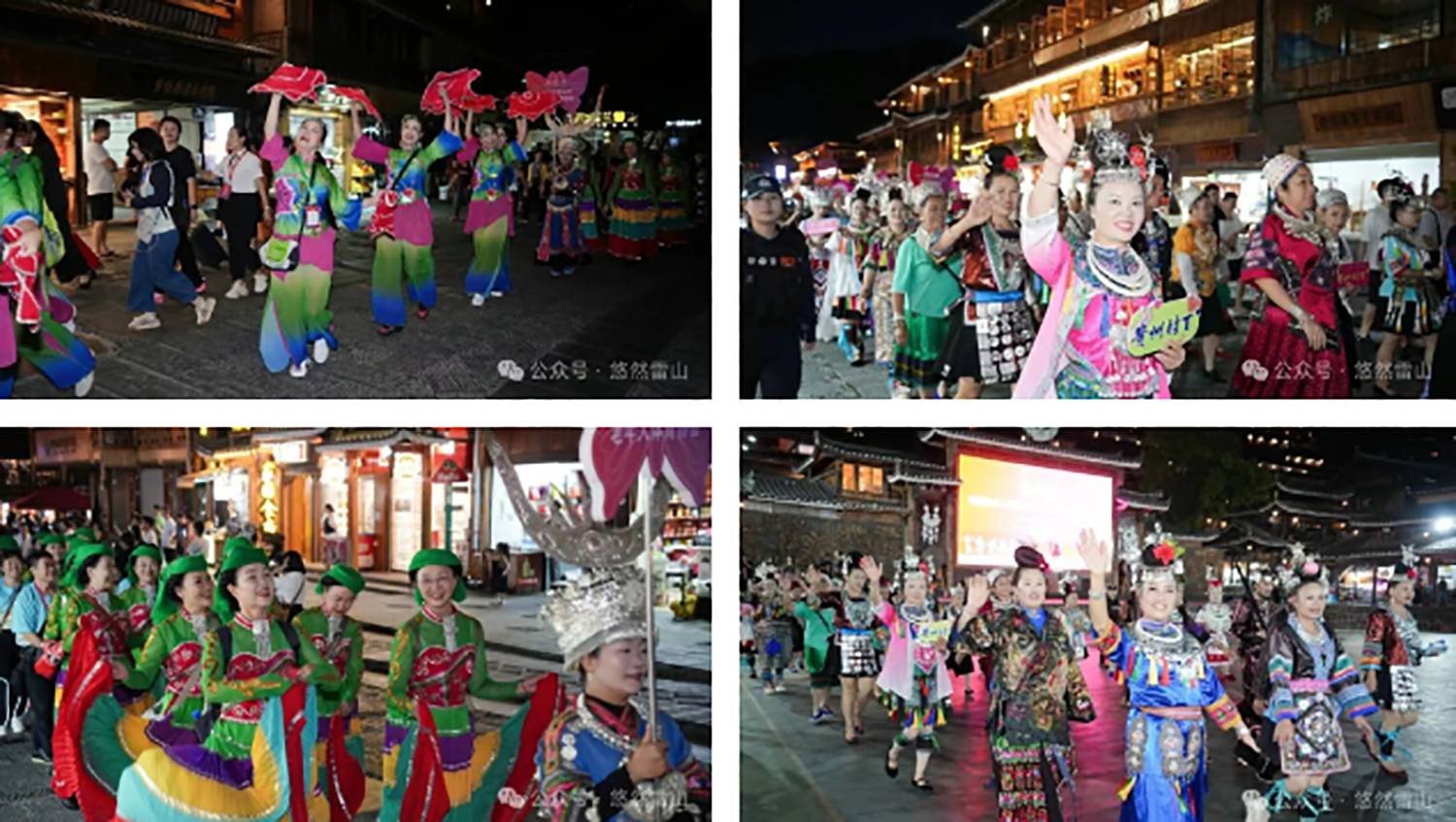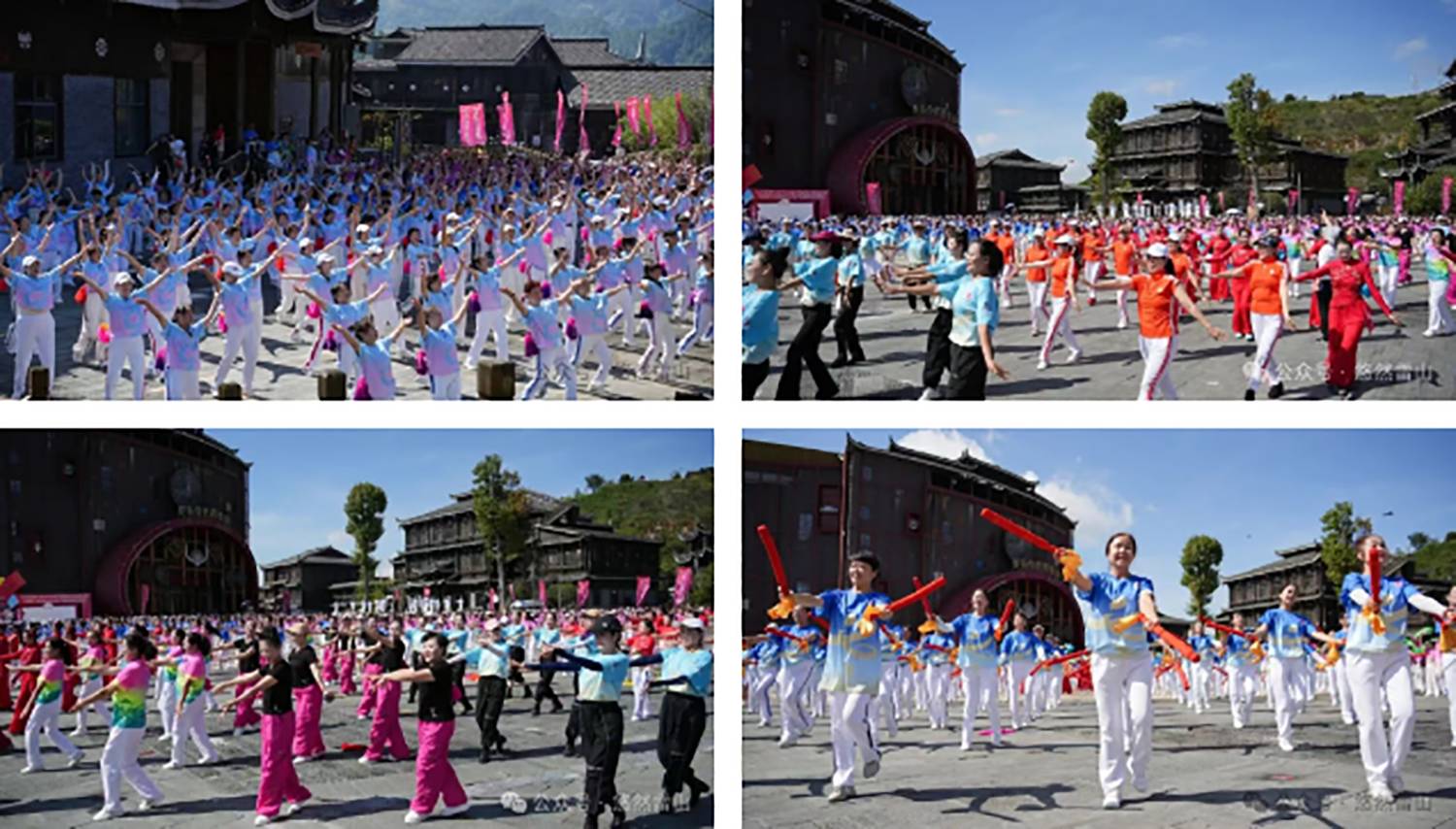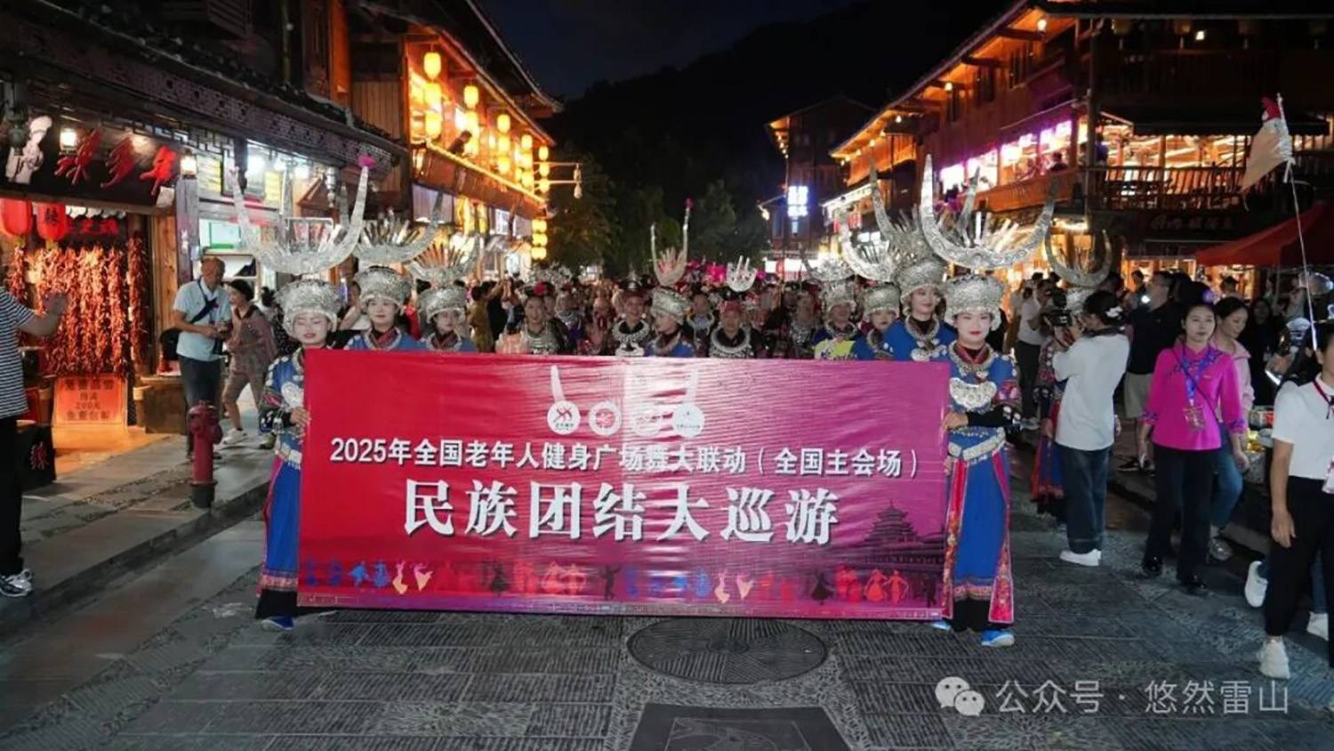 活动当天还举行了民族团结大巡游。特色节目的参演团队携手黔东南州代表队、雷山县代表队,以及来自全国的各支健身广场舞展示队伍齐聚西江千户苗寨,穿梭于苗寨之中,与古朴的建筑和热情的游客交织成一幅绚丽多彩的民族文化画卷,生动展现了中华民族团结奋进、和谐共荣的美好景象。随后,巡游队伍齐聚芦笙场,进行村T服装展示以及广场舞展演。