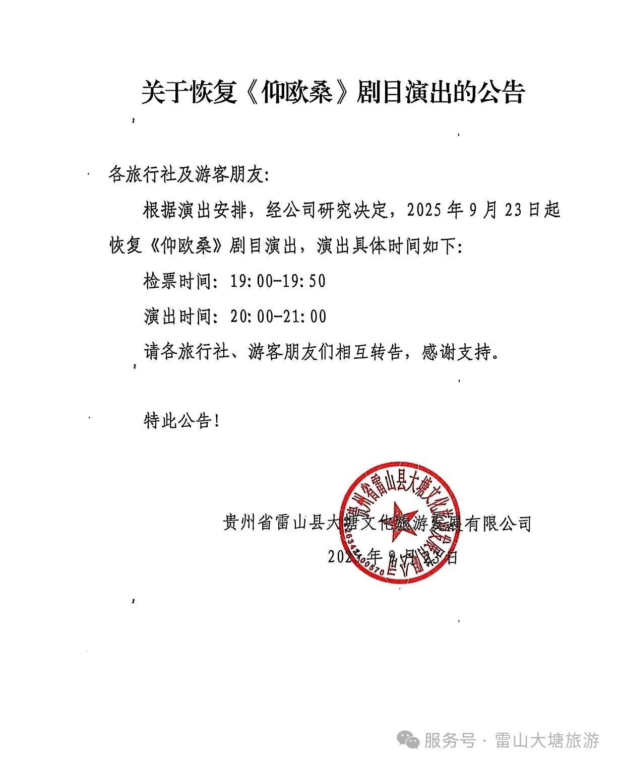 关于大型实景苗族歌舞诗剧《仰欧桑》演出恢复的公告