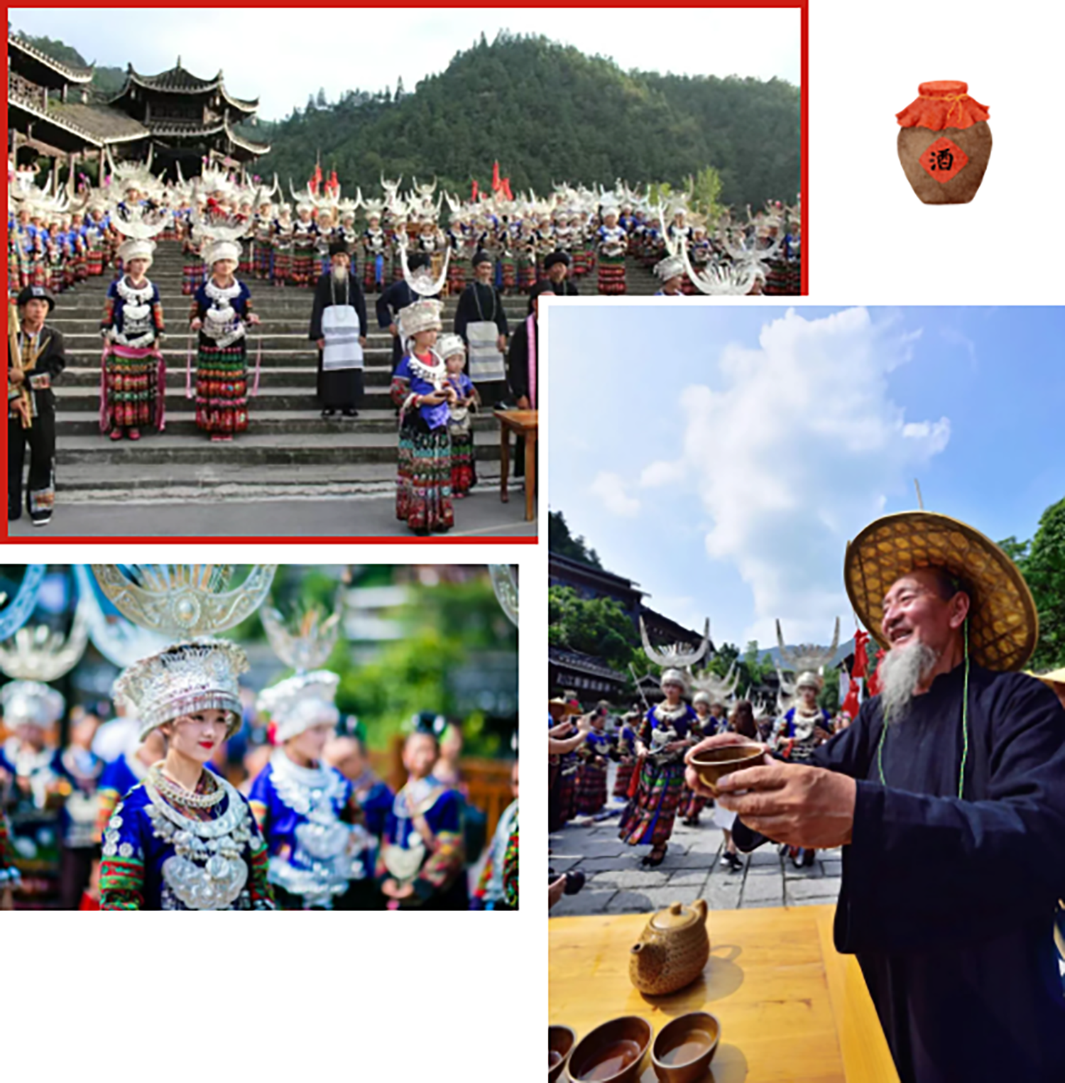 苗族人依山而居,酒碗叠成瀑布,清甜的米酒接连不断,热情像瀑布一样丝毫不减。这是苗家人用酒作语言的真诚表达,是对客人最直白的尊重与欢迎。