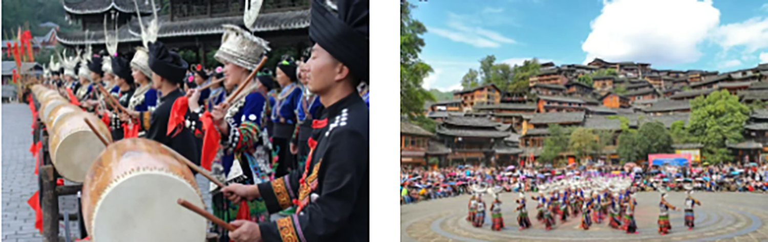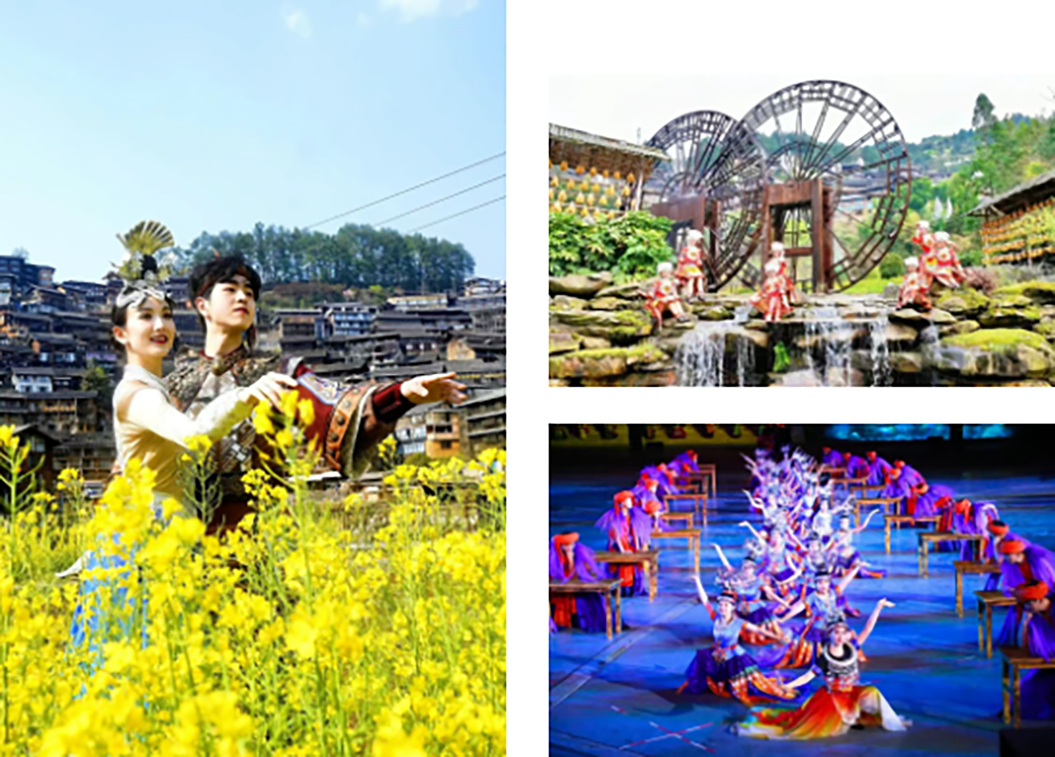 第一天到西江千户苗寨、郎德苗寨体验景区民族文化活动,晚上前往大塘仰欧桑观看演艺剧目,住仰欧桑·水上粮仓酒店,返程。