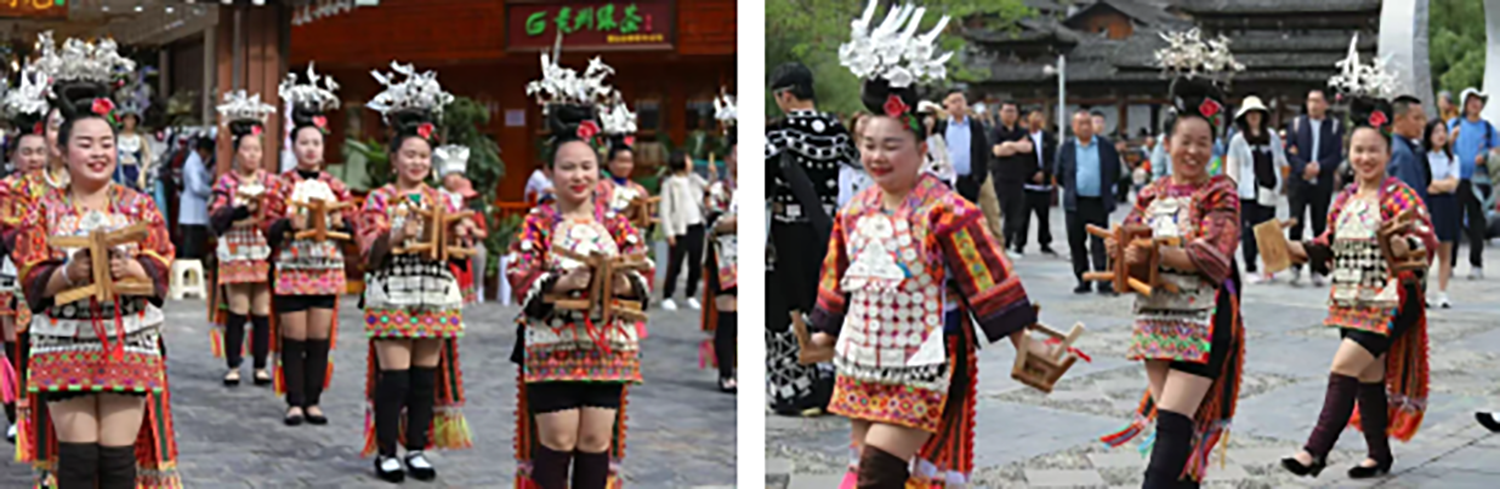 在北门索道口文化广场上,即将有一场苗族竹竿舞;身着盛装的苗族阿妹阿哥手握柱子,随着芦笙旋律整齐开合;在西江,快乐从不是旁观的风景,是亲身体验。
