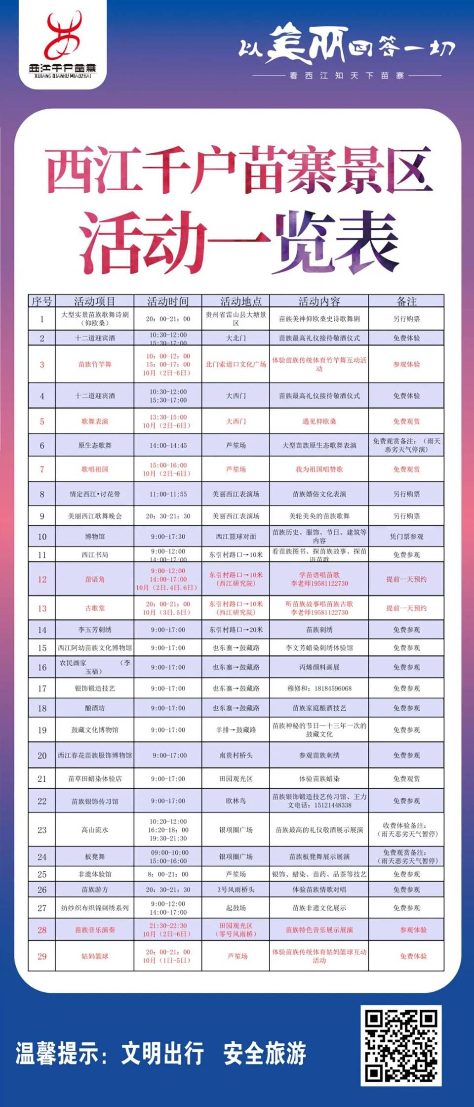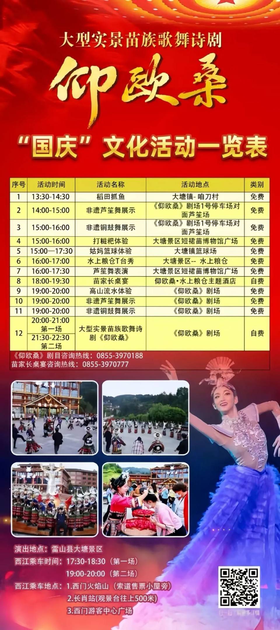 《蝶当久演艺团队-美丽西江国庆狂欢》歌舞表演:蝶当久带领团队演唱《对歌对到日落坡》《银白色的山歌》歌曲融合了苗族传统音乐元素与现代曲风,当苗歌遇上现代乐,让年轻人听懂传统的浪漫。更有国庆特别改编版,融入芦笙、木叶等苗族乐器,给老歌赋予新的生命力。还可以上台与蝶当久一起合唱,感受这场不一样的文化碰撞。