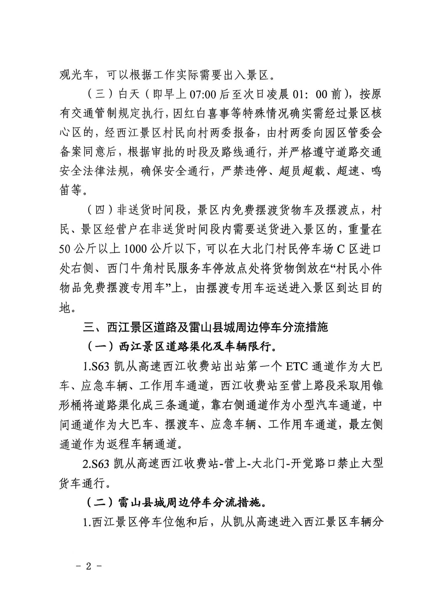 (三)白天(即早上07:00后至次日凌晨01:00前),按原有交通管制规定执行,因红白喜事等特殊情况确实需经过景区核心区的,经西江景区村民向村两委报备,由村两委向园区管委会备案同意后,根据审批的时段及路线通行,并严格遵守道路交通安全法律法规,确保安全通行,严禁违停、超员超载、超速、鸣笛等。