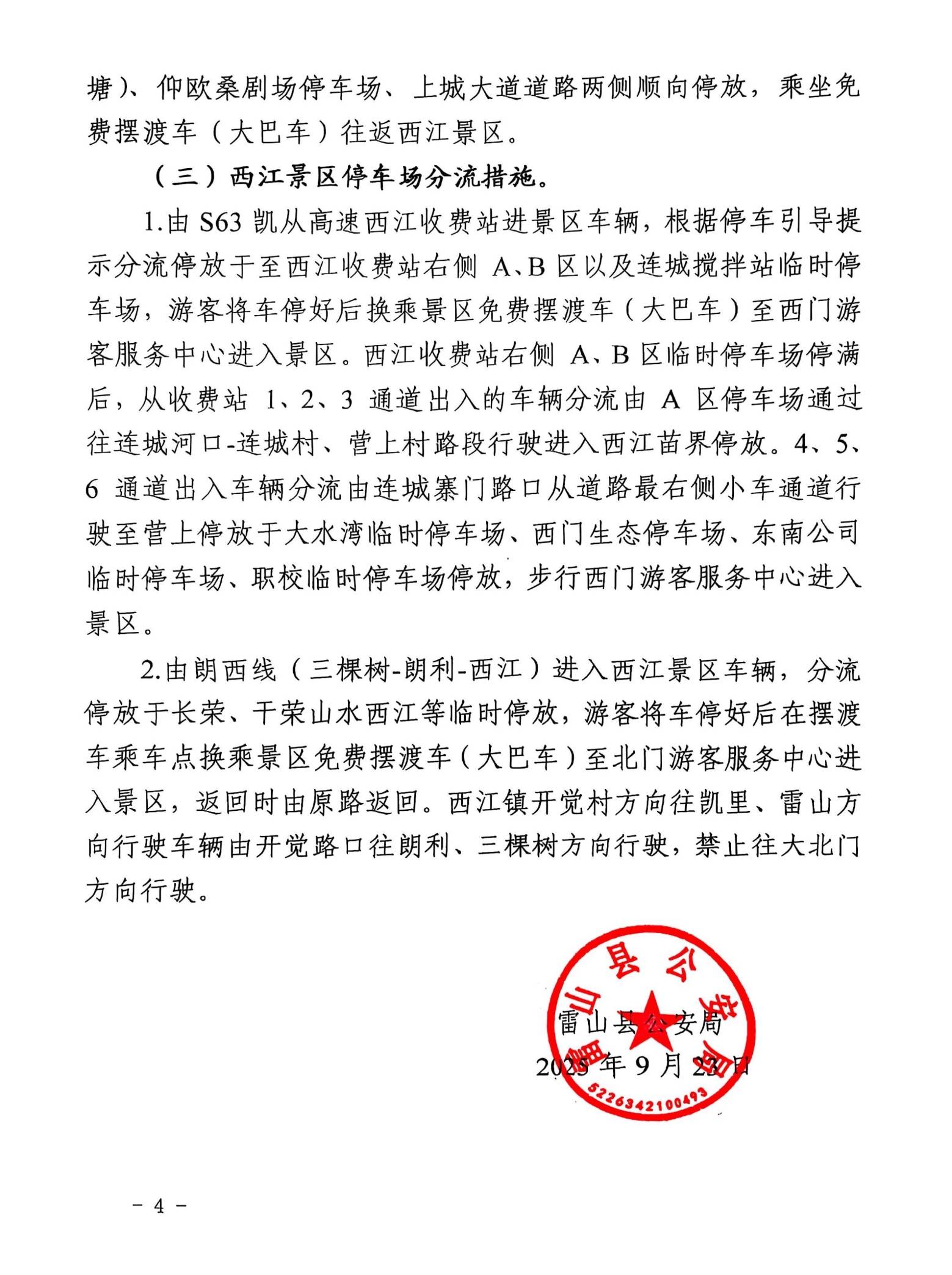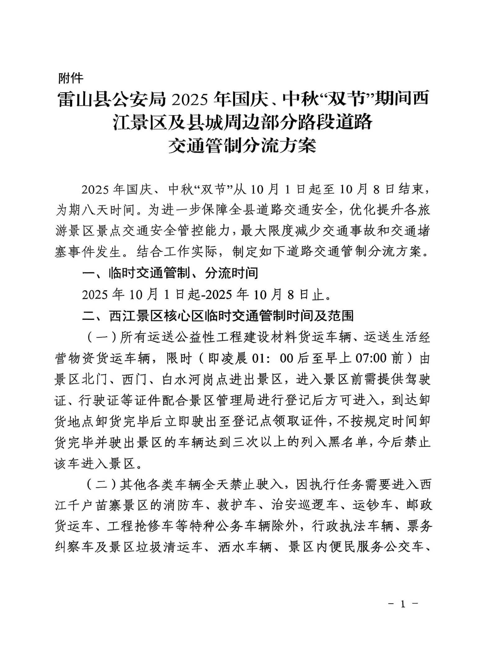 雷山县公安局2025年国庆、中秋“双节”期间西江景区及县城周边部分路段临时道路交通管制分流通告