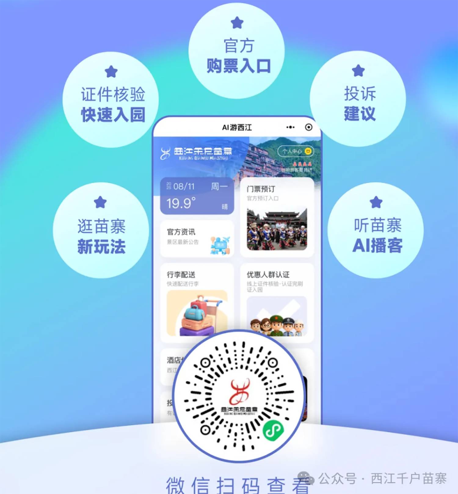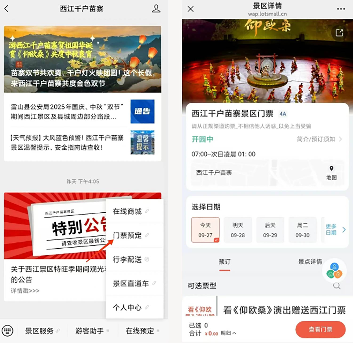 游客可在西江千户苗寨景区微信公众号、西江景区官方网站、AI游西江、一码游贵州及美团、携程OTA等渠道进行实名预约购票。