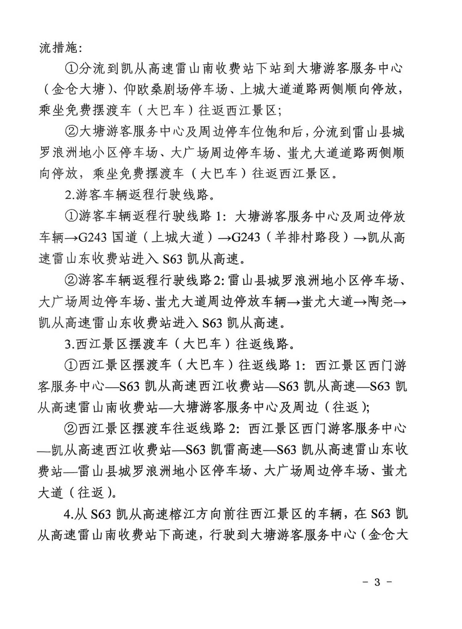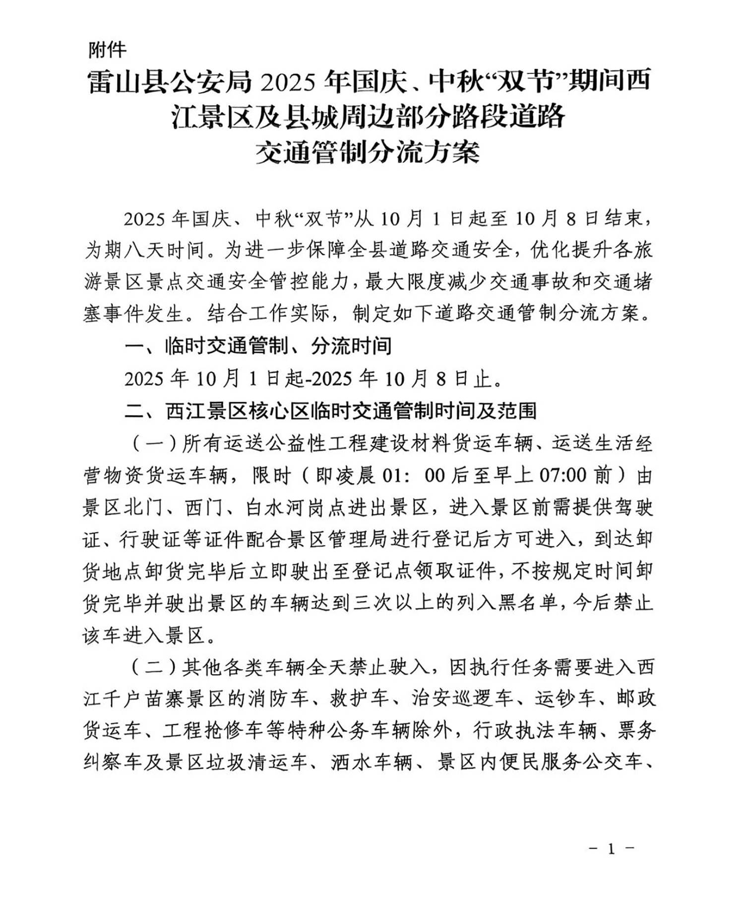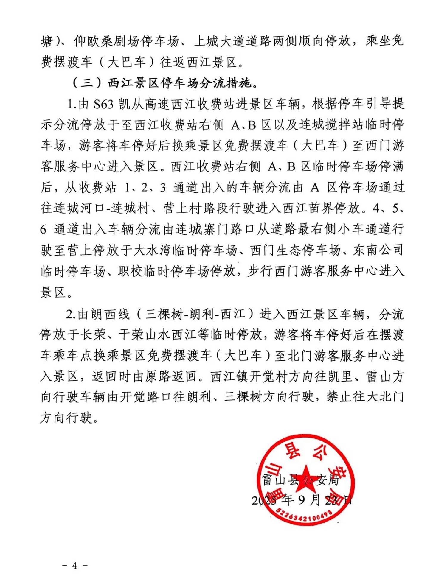 四、注意停车安全。为保障广大游客群众便捷出行,国庆期间西江千户苗寨景区共开放西门生态停车场、北门备用停车场、高速口临时停车场、长荣临时停车场,请游客朋友服从现场交警指挥,严禁乱停乱放。(针对路程较远的停车场,景区将免费安排大巴车接送)