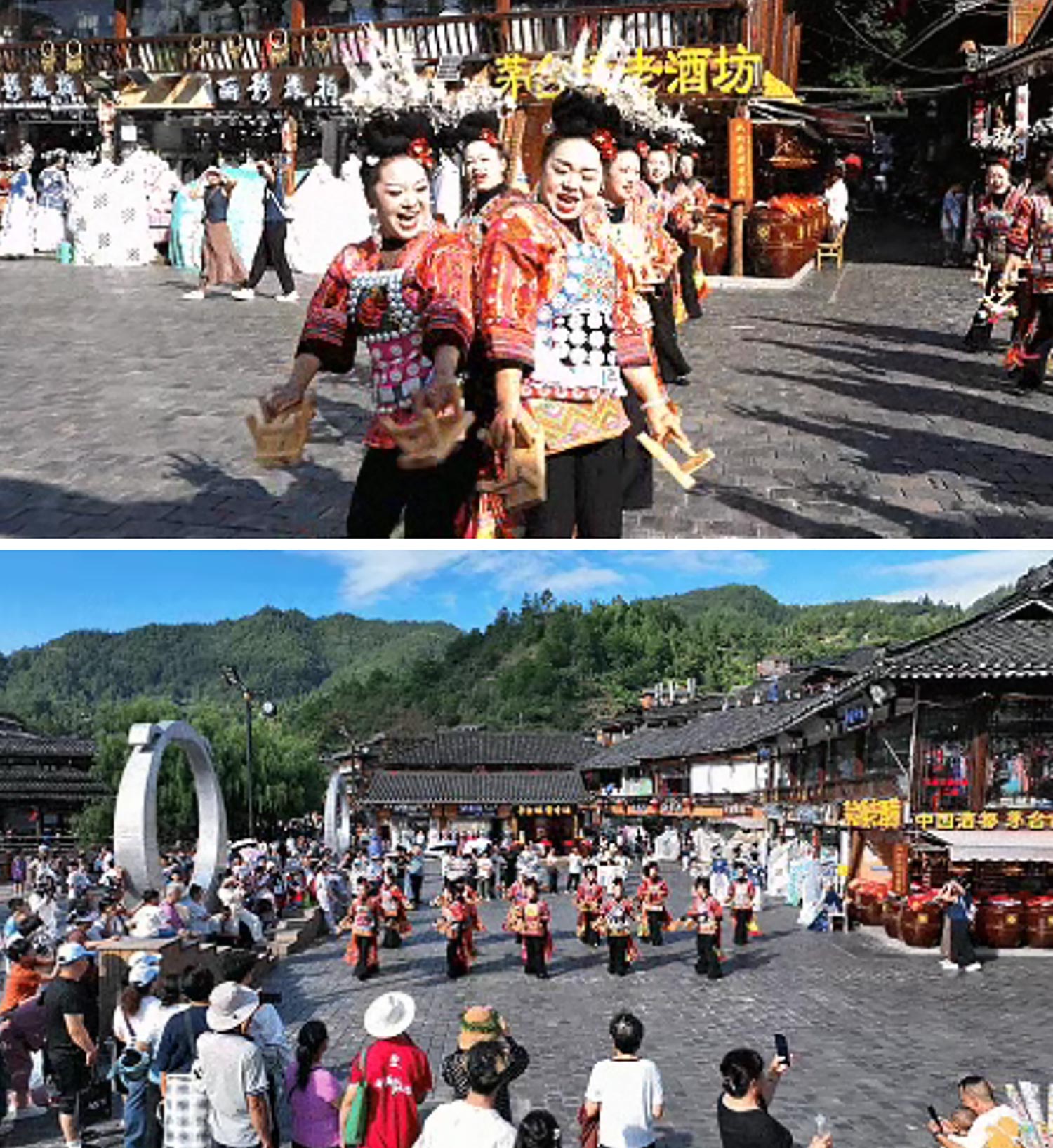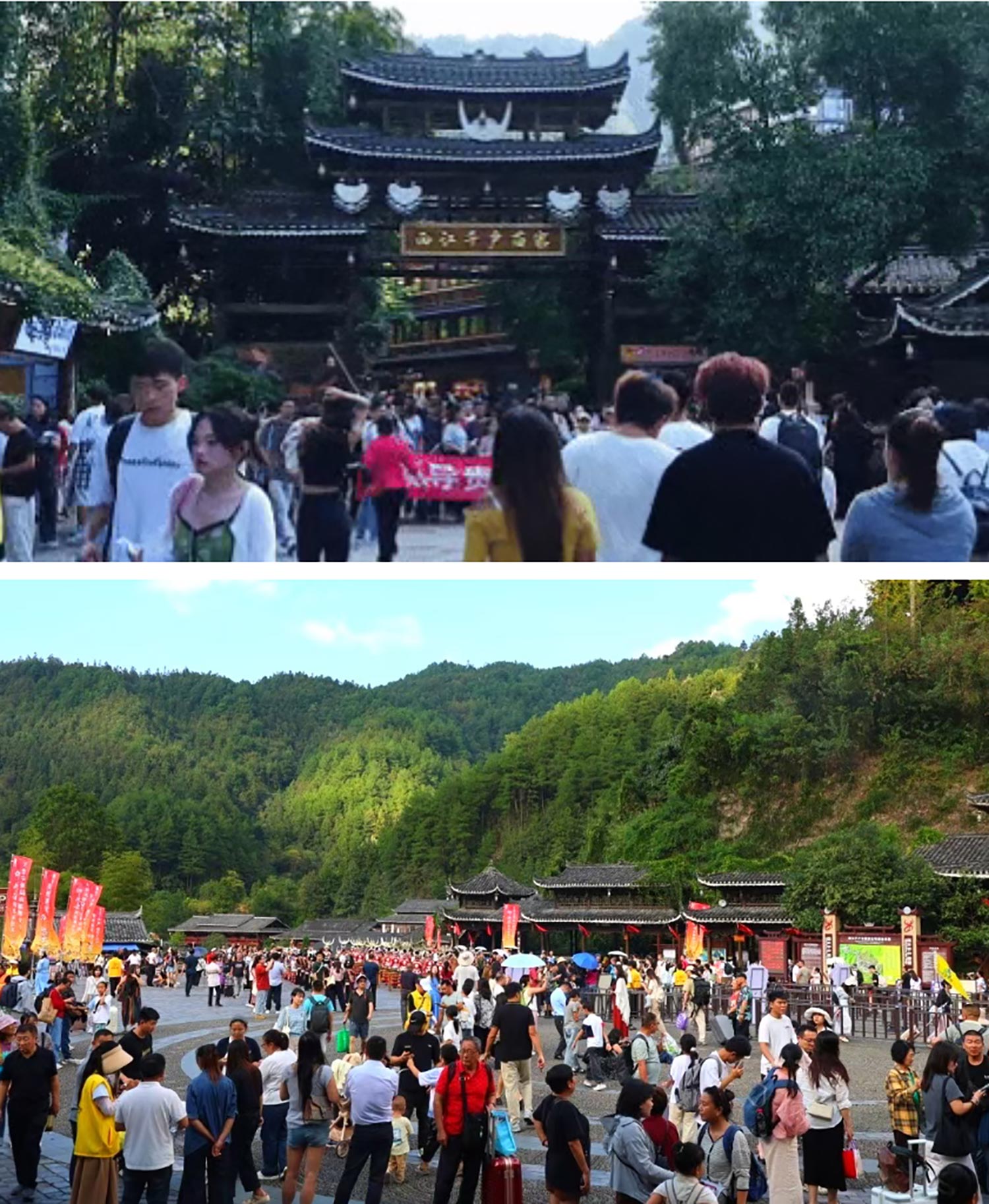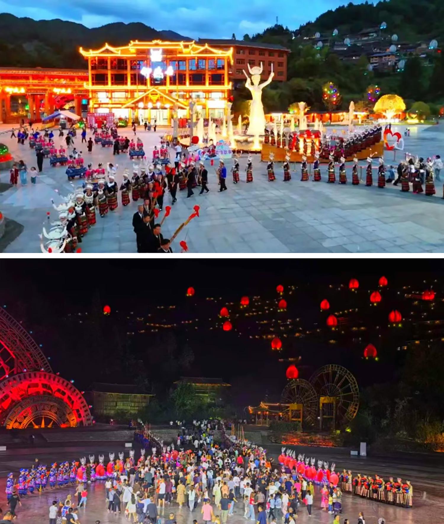 当国庆的红旗掠过苗家飞檐,中秋的月光洒遍千户群落,西江千户苗寨和大塘仰欧桑剧场被节日热潮包裹,人头攒动,剧场座无虚席。苗寨的每条石板路、每处活动场地都被往来人群填满,连风里都飘着欢腾鲜活的气息。