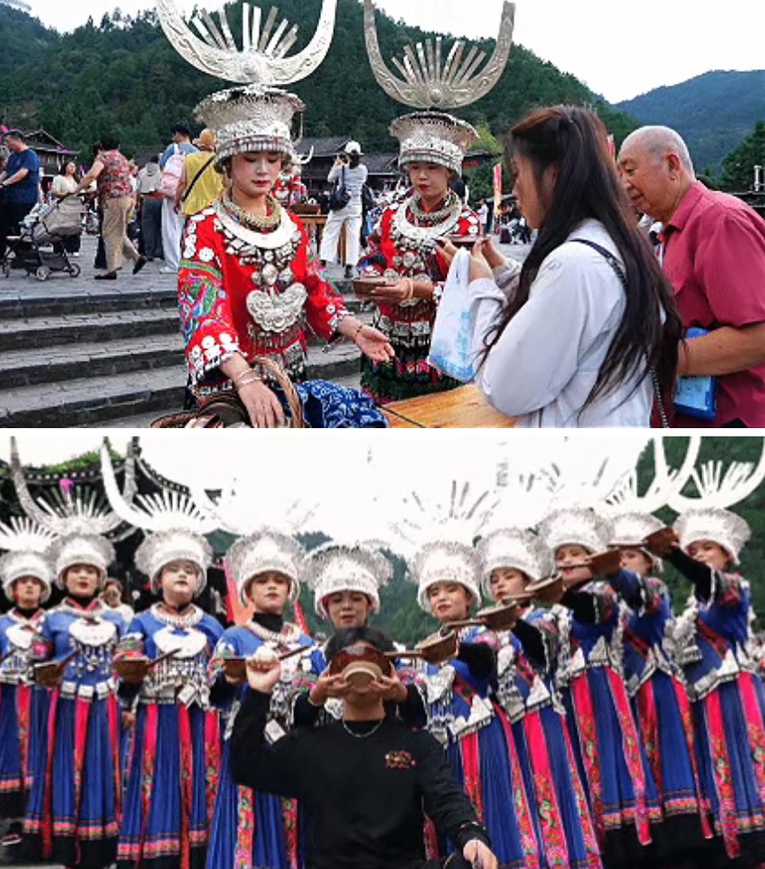 游客们带着笑意蹦进竹竿阵,和苗家姑娘们跳起竹竿舞。银项圈广场的氛围更显鲜活,“高山流水”、十二道拦门酒同样热闹。游客们举着手机,看着前方的人在苗家姑娘的歌声里饮下佳酿,忍不住跟着欢呼,手机镜头齐刷刷对准台前,连快门声都融进了热闹里。