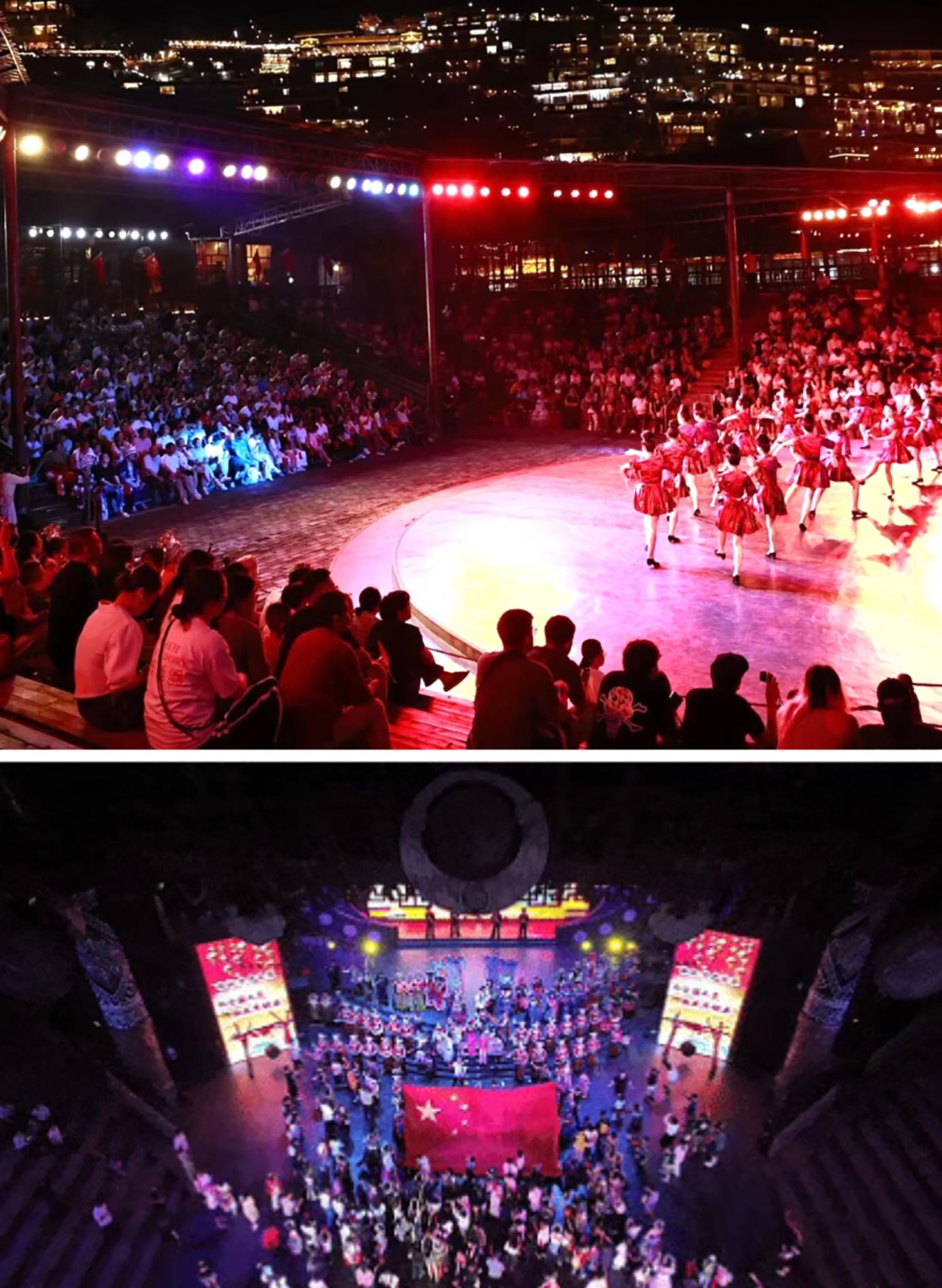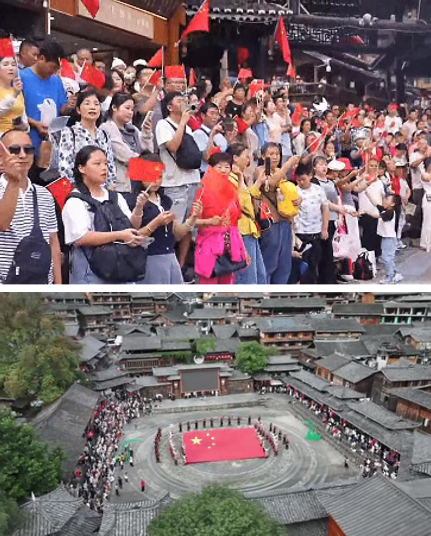身着苗族盛装的姑娘们合着节奏走进场地,敬酒歌、苗族游方、原生态民俗展演等活动相继拉开帷幕。当表演行至尾声,《歌唱祖国》的前奏猛然奏响。游客们不约而同起身,手中挥舞着小国旗,纷纷汇入合唱的队伍,刹那间将全场的热烈气氛推向顶点。