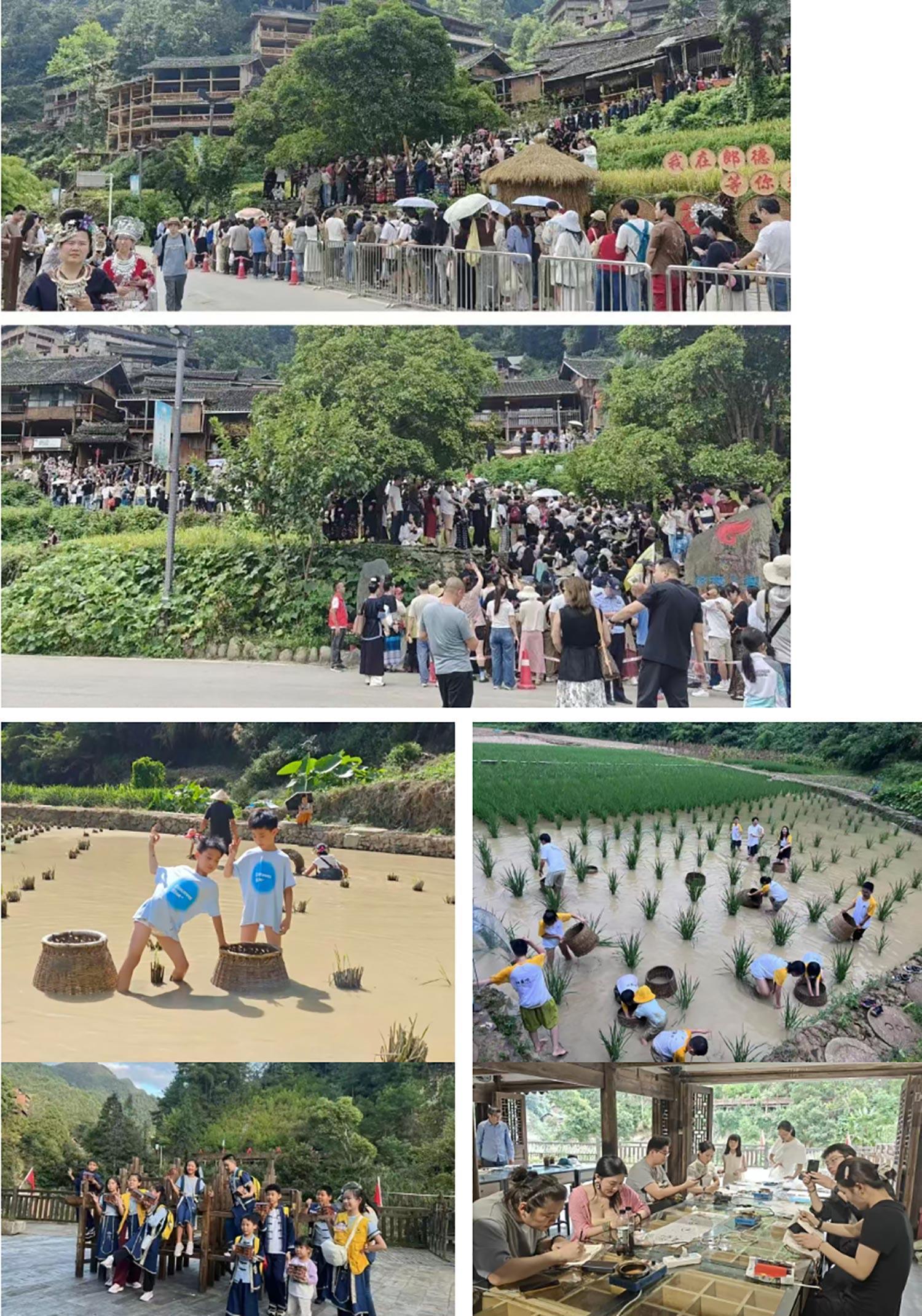 寨门口,身着盛装的苗家儿女捧着拦门酒,迎接一波接一波的游客,体验抓鱼插秧苗、非遗蜡染。芦笙场上歌舞表演、篝火晚会,游客们跟着苗家阿妹的节奏起舞,欢歌笑语交织一片,人气旺,烟火足。