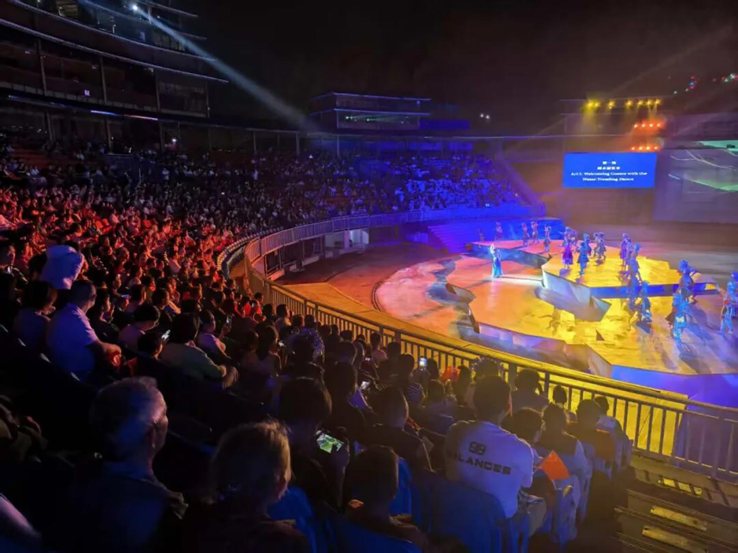游客们在看剧前到新桥村“水上粮仓”喝十二道拦门酒,看T台秀,或加入打糍粑的队伍,仰欧桑剧场外,铜鼓声中有人围观看抓鱼的乐趣等等。进入剧场内座无虚席,此起彼伏的掌声与欢呼声是对这场精彩演艺的最好评价。