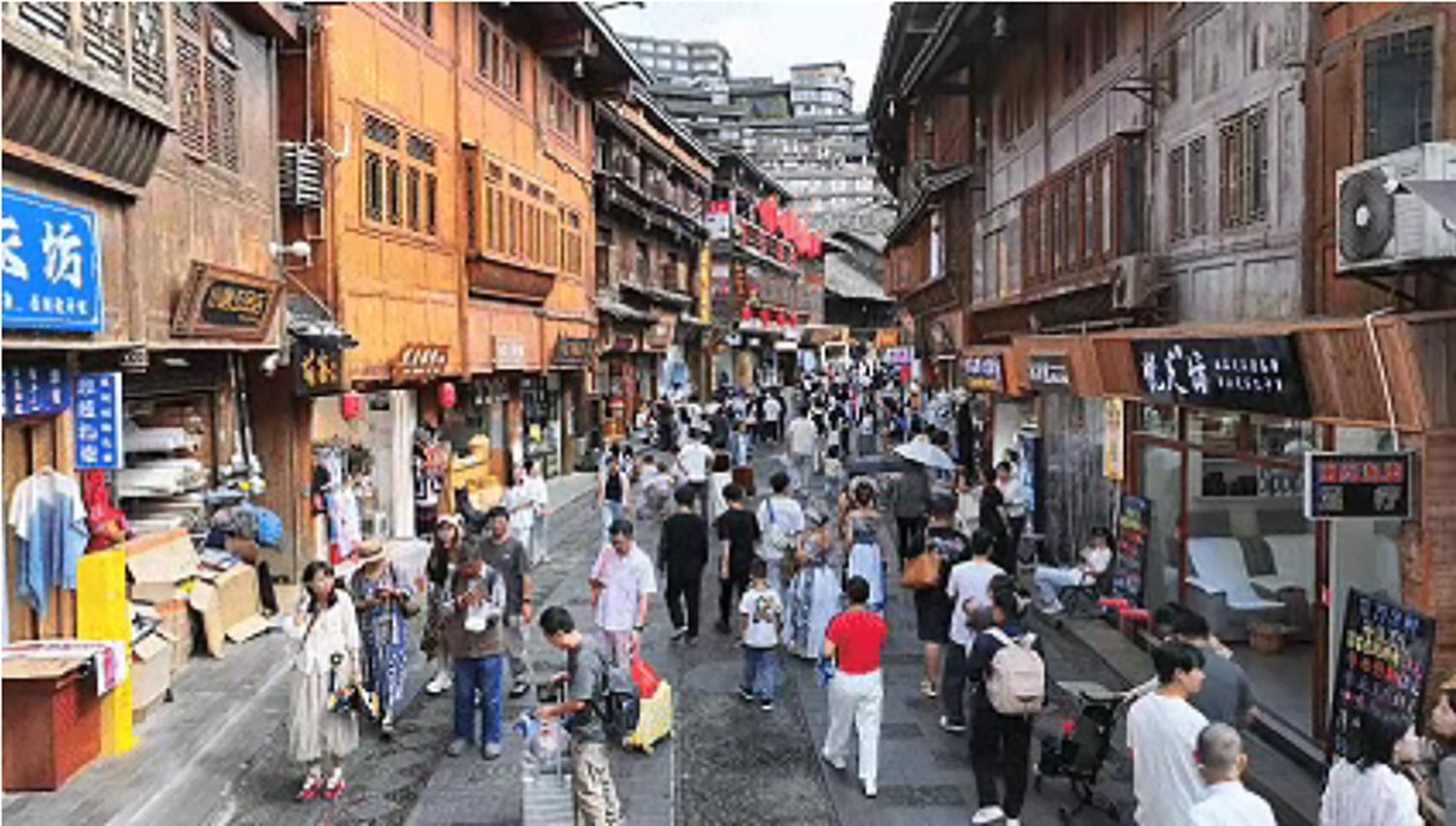 刚到景区入口,就能感受到扑面而来的“人气”——游客沿着长街漫步苗寨,原本宽敞的步道此刻成了“流动的热闹场”,脚步慢下来,反而多了几分烟火气。