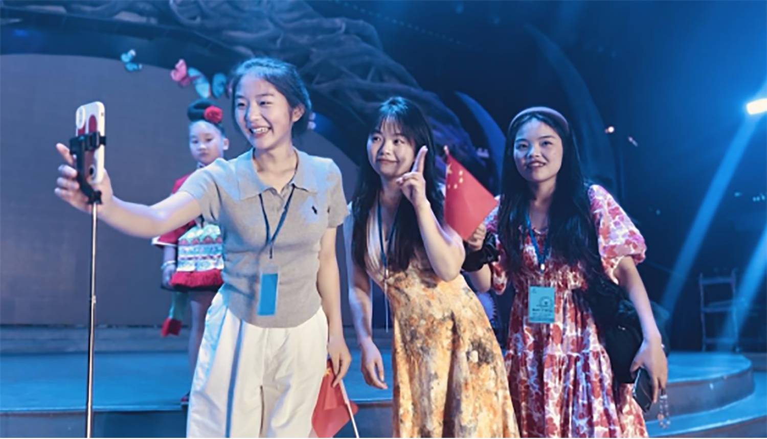 在沸腾的观众席中,来自黔东南州台江县的苗族姑娘杨小妃和樱桃,演出结束后,他们不时在舞台上拍照留恋,格外显眼,他们微笑着分享了自己的故事:“我和蝶当久老师是同乡,从小就听着他的歌长大,他的《苗家人》我能整首背唱。前几天刷到他在西江演出的消息,立马约了姐妹们从台江赶过来,就为了现场听一次这熟悉的乡音。”