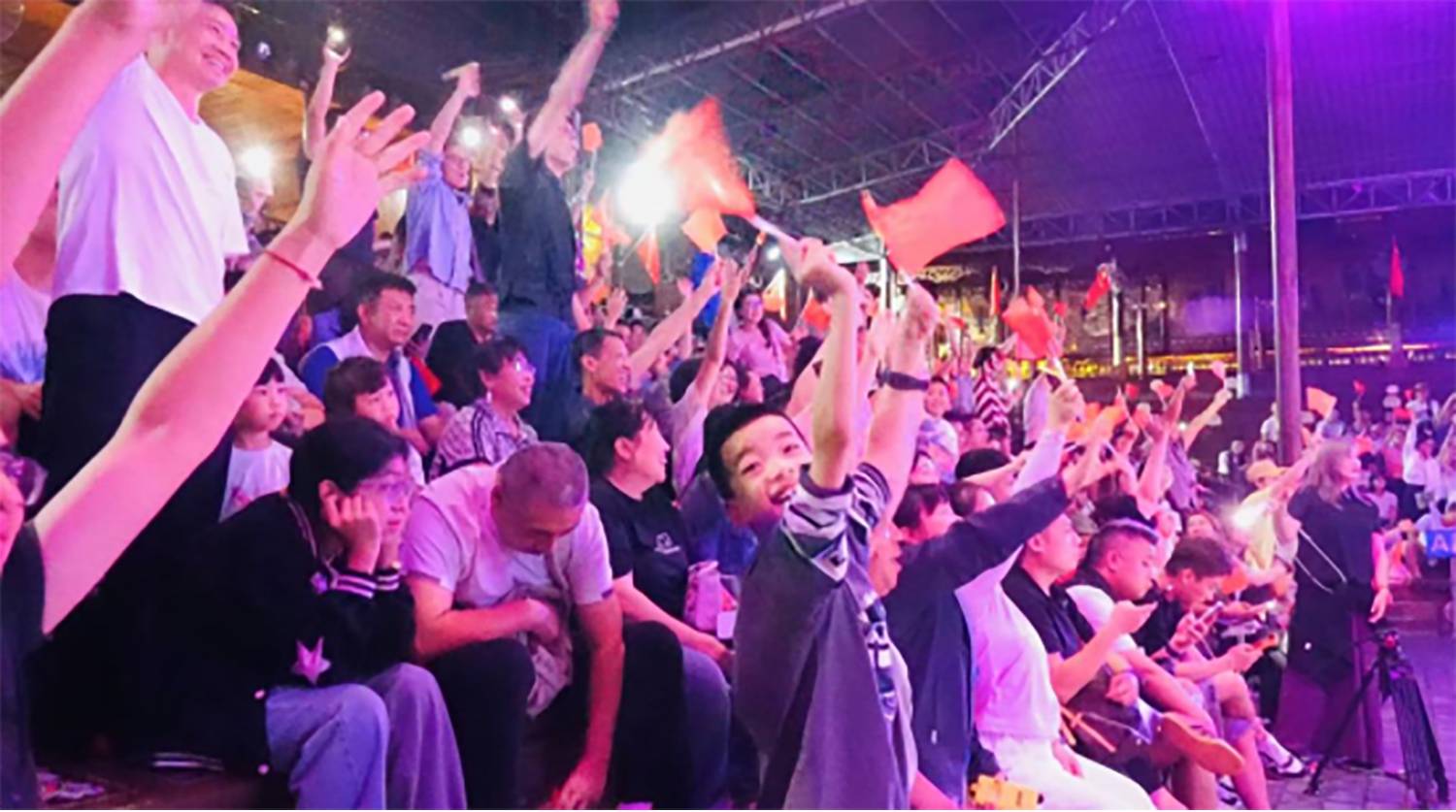 经过前三场的打磨,第四场演出的互动环节更显默契与温情。“高山流水”敬酒仪式上,演员们与观众的歌声配合得愈发融洽,清甜米酒流淌间,陌生的距离被瞬间拉近。当巨幅五星红旗缓缓展开,《歌唱祖国》的旋律响起,观众们自发起身涌向舞台,手挽手形成红色人墙,嘹亮的歌声在山谷间久久回荡。