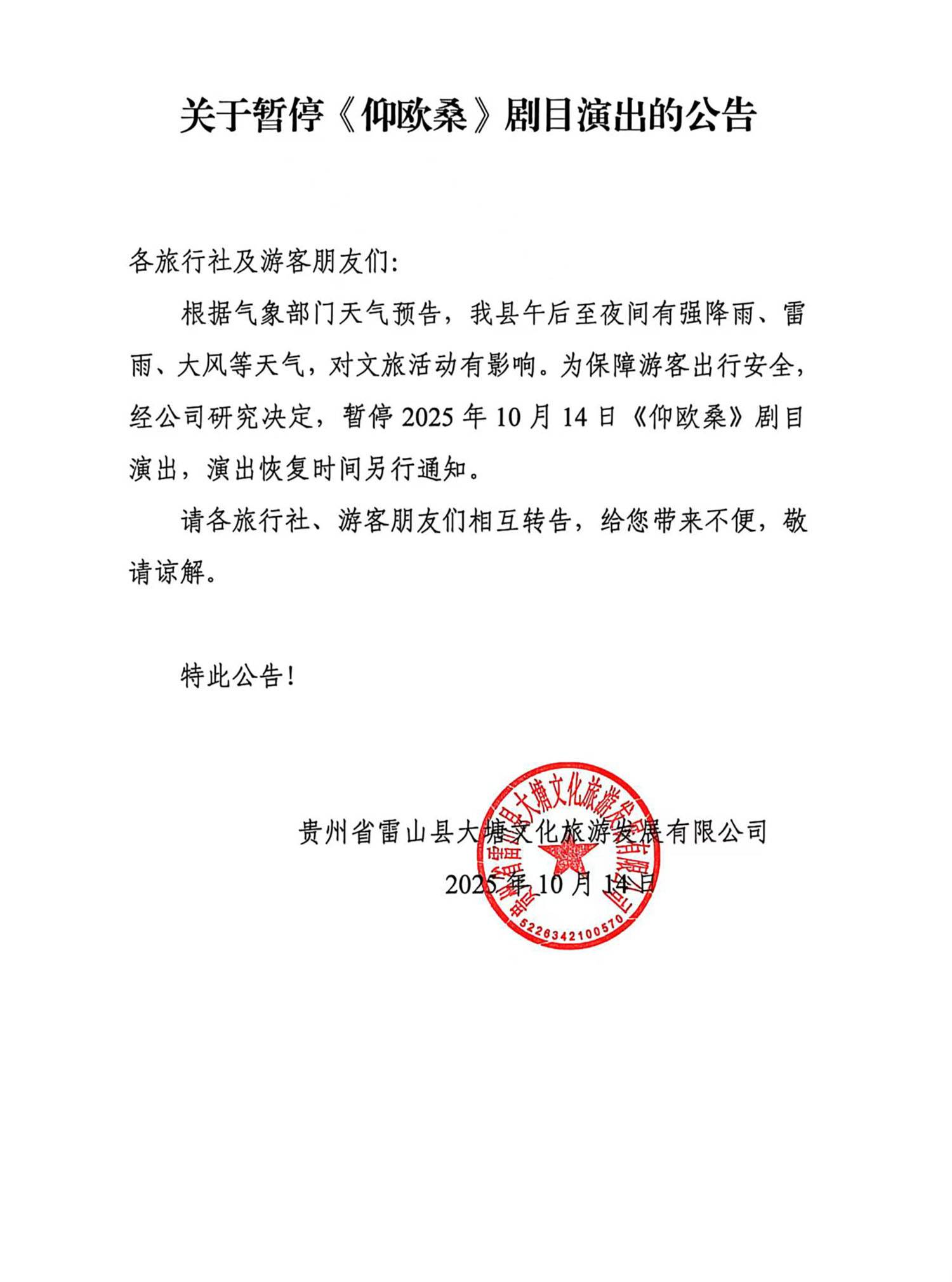 关于暂停《仰欧桑》剧日演出的公告