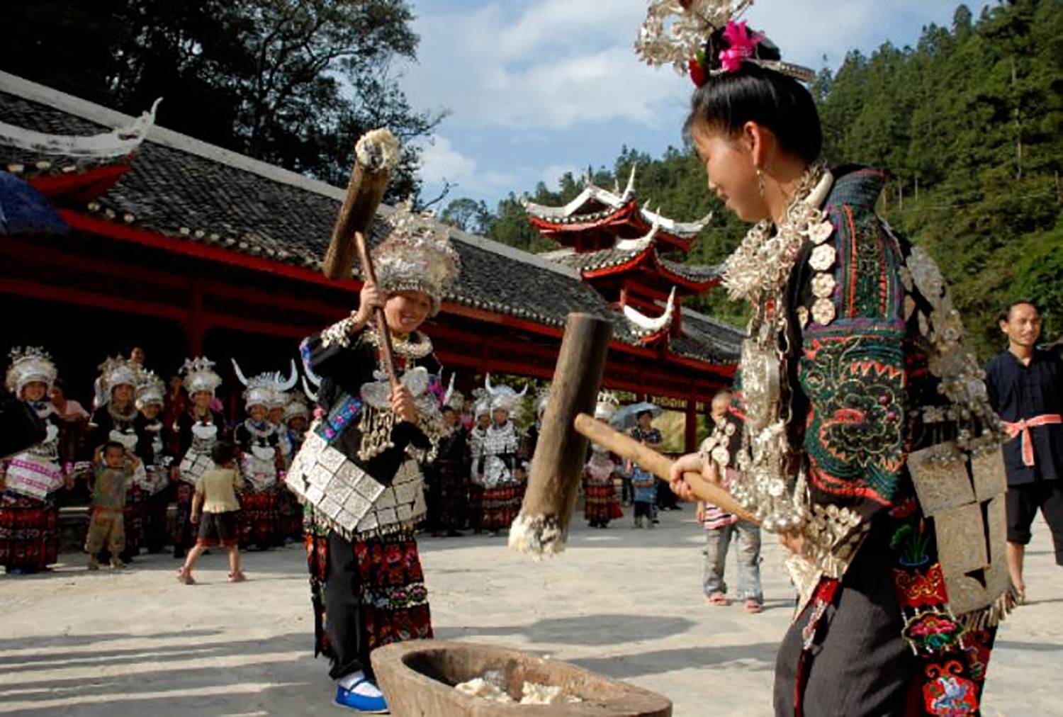 走进苗家木楼,体验打糍粑的乐趣。蒸熟的糯米倒入木槽,两人一组,你一下我一下地捶打,直到米粒变成绵软柔韧的糍粑。这不仅是制作美食,更是苗家人团结协作的象征。