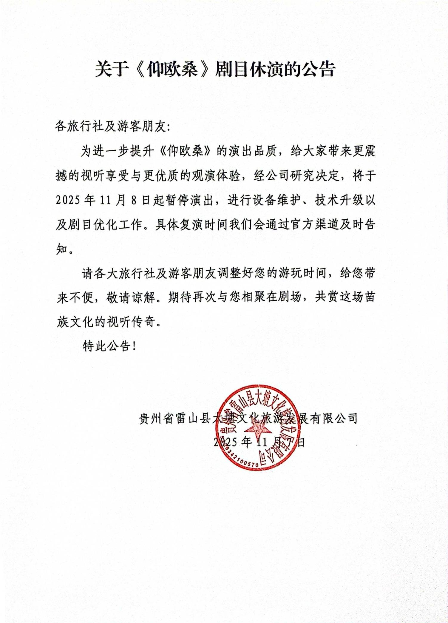 关于《仰欧桑》剧日体演的公告