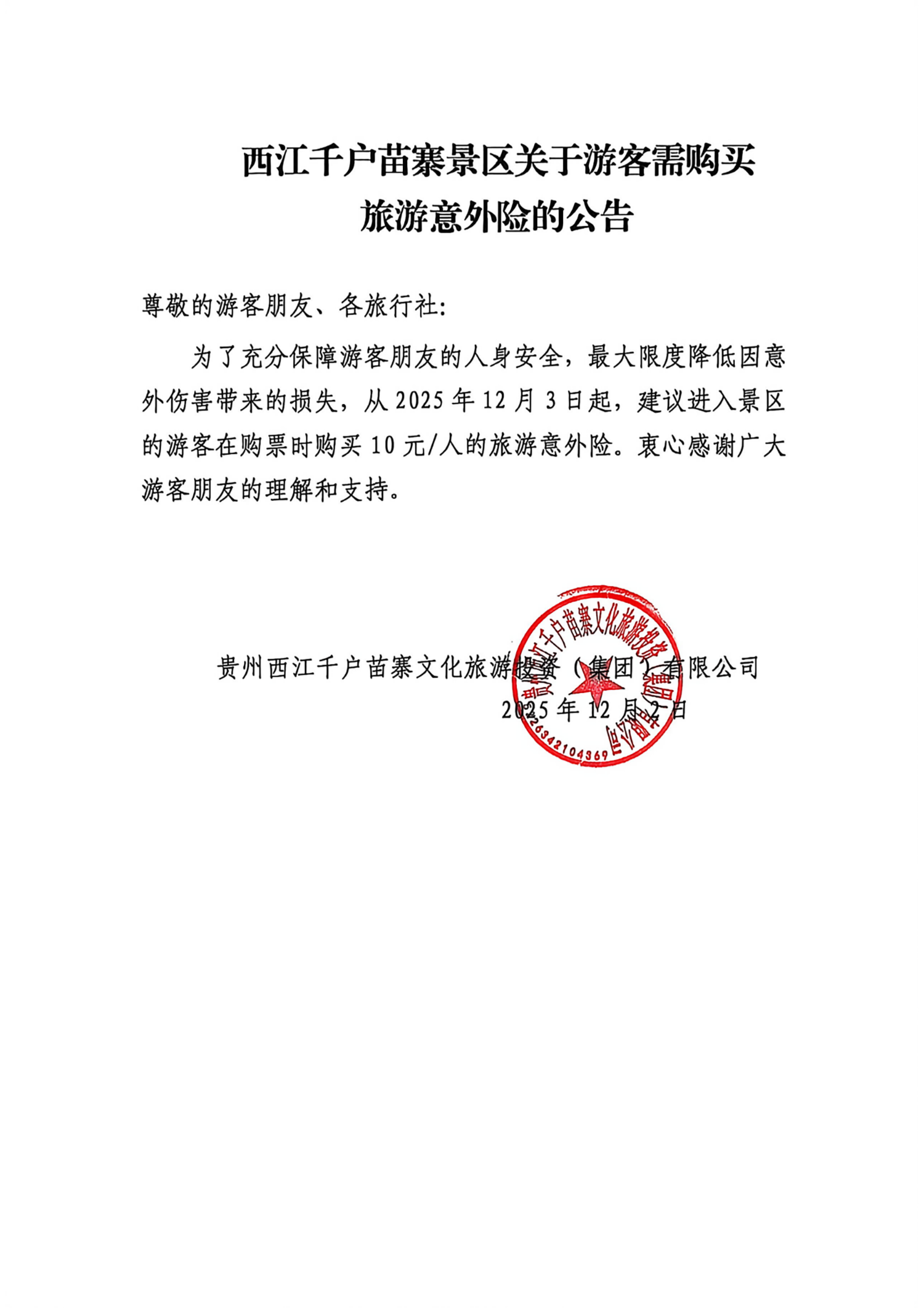 西江千户苗寨景区关于游客需购买旅游意外险的公告