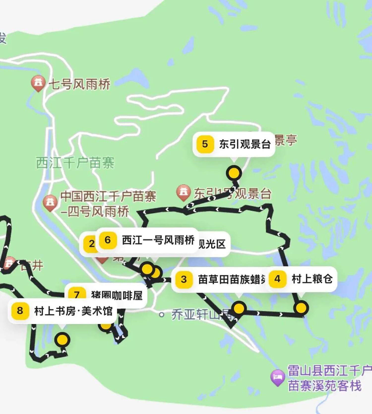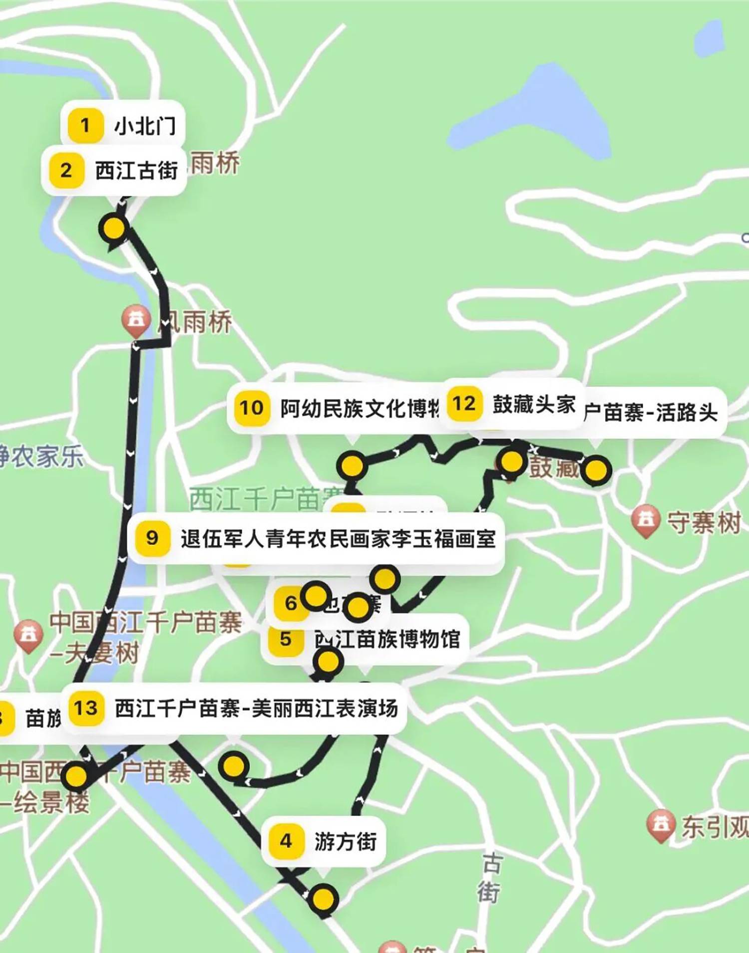 小北门→古街→苗族银饰传习馆→游方街→西江苗族博物馆→也东寨→阿幼苗族手工艺体验基地→酿酒坊→农民画家李玉福→阿幼民族博物馆→活路头家→鼓藏头家→美丽西江表演场